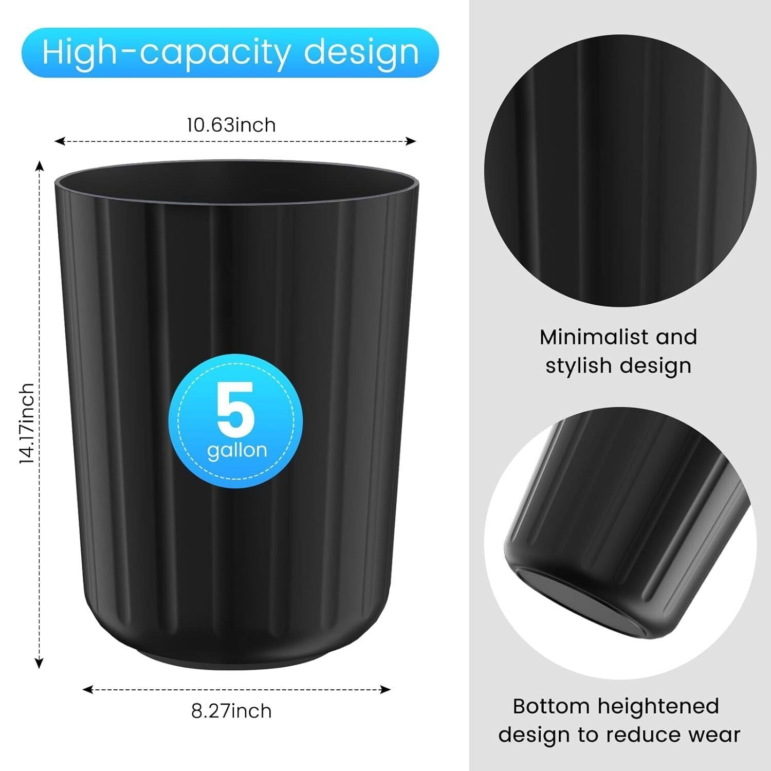 Large 5-Gallon Capacity Spacious enough for daily waste disposal yet compact enough to fit under sinks or in small corners ideal for home or office use. Open-Top, Convenience The lidless design makes it easy to toss waste quickly and hygienically, perfect for bathrooms, kitchens, and other frequently used spaces. Sleek Round Design Its smooth, rounded shape blends seamlessly with modern interiors and easily fits beside toilets, desks, or cabinets. Durable & Lightweight Crafted from premium plastic that resists stains, odors, and everyday wear. Easy to clean with just a quick wipe. Multi-Room Versatility Perfect for use in bathrooms, bedrooms, kitchens, dorms, and offices. A simple yet functional addition to any space.