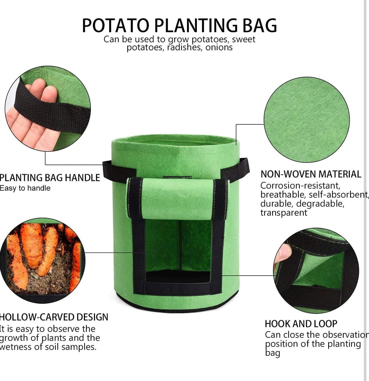 • 【Unique Design】First, with the Flap Velcro Window, you can observe the growth of roots, quickly and accurately determine whether potatoes are ripe and harvest them directly. Second, reinforced on the left and right sides of the bag for easy movement. Durable planting bag with superb process in sewing. Look forward to your harvest.