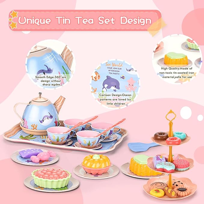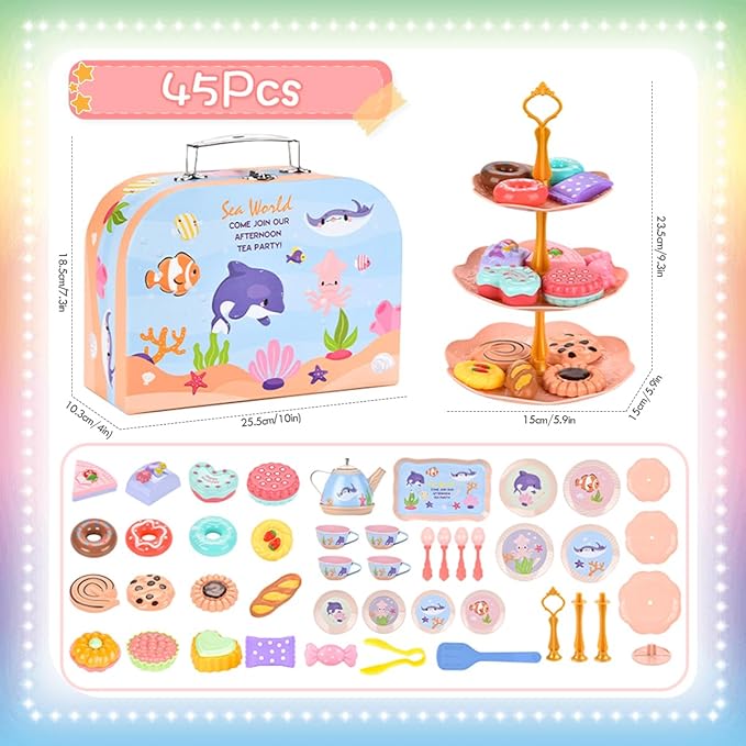 45Pcs Tea Party Set for Little Girls Princess Tea Time Toy Playset Ocean/Dinosaur Theme Kids Tea Set with Desserts & Carrying Case Kitchen Pretend Toy T134