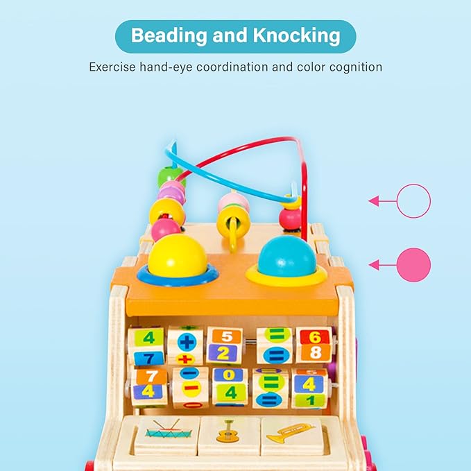• 🚐5-1 Educational Toys: wooden preschool educational toys for children include play bead maze, number series, shape series, crawling toys, hammer toys, which can cultivate color, shape recognition and classification ability, exercise hand-eye coordination, stimulate children's creativity and imagination.