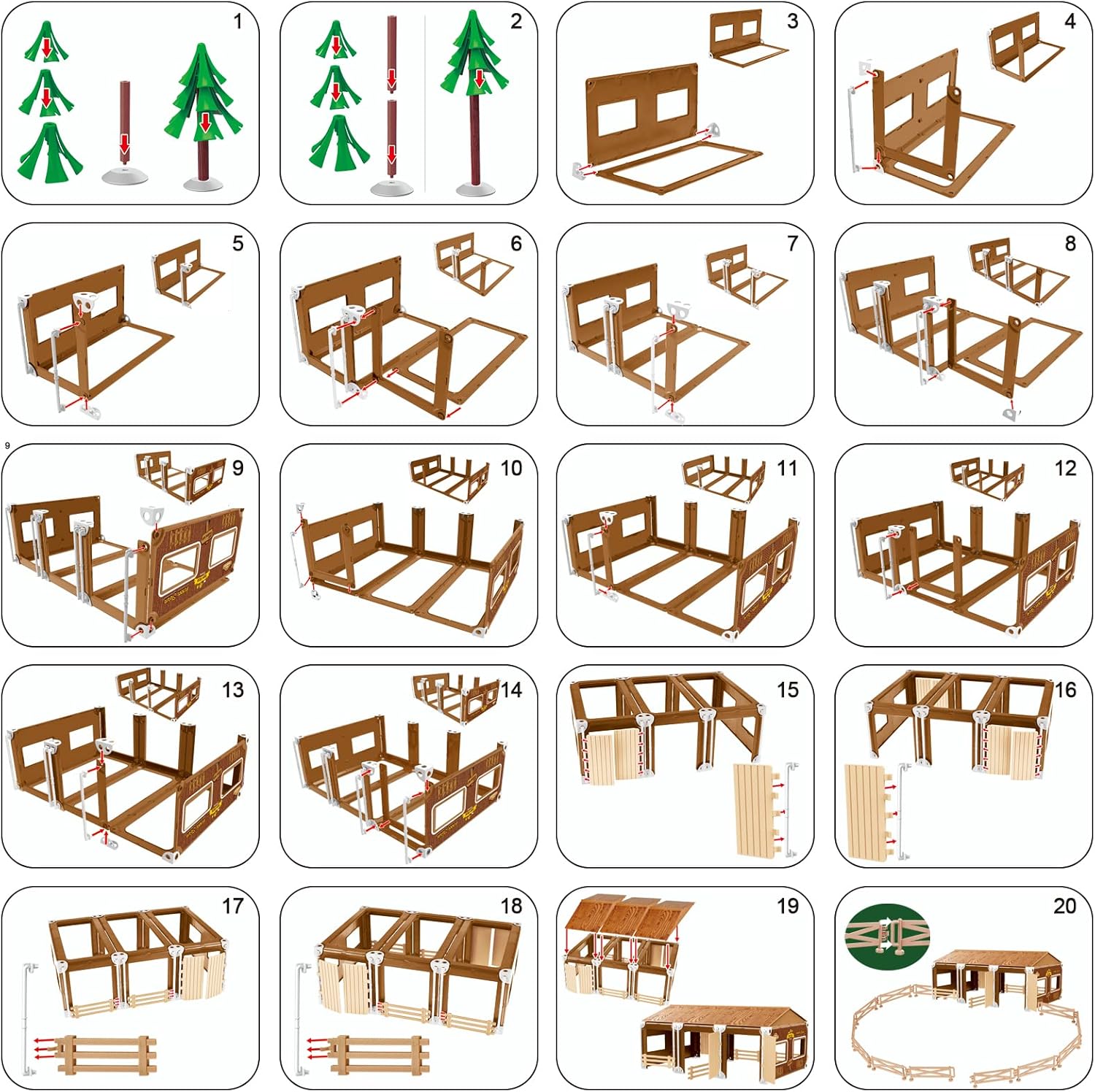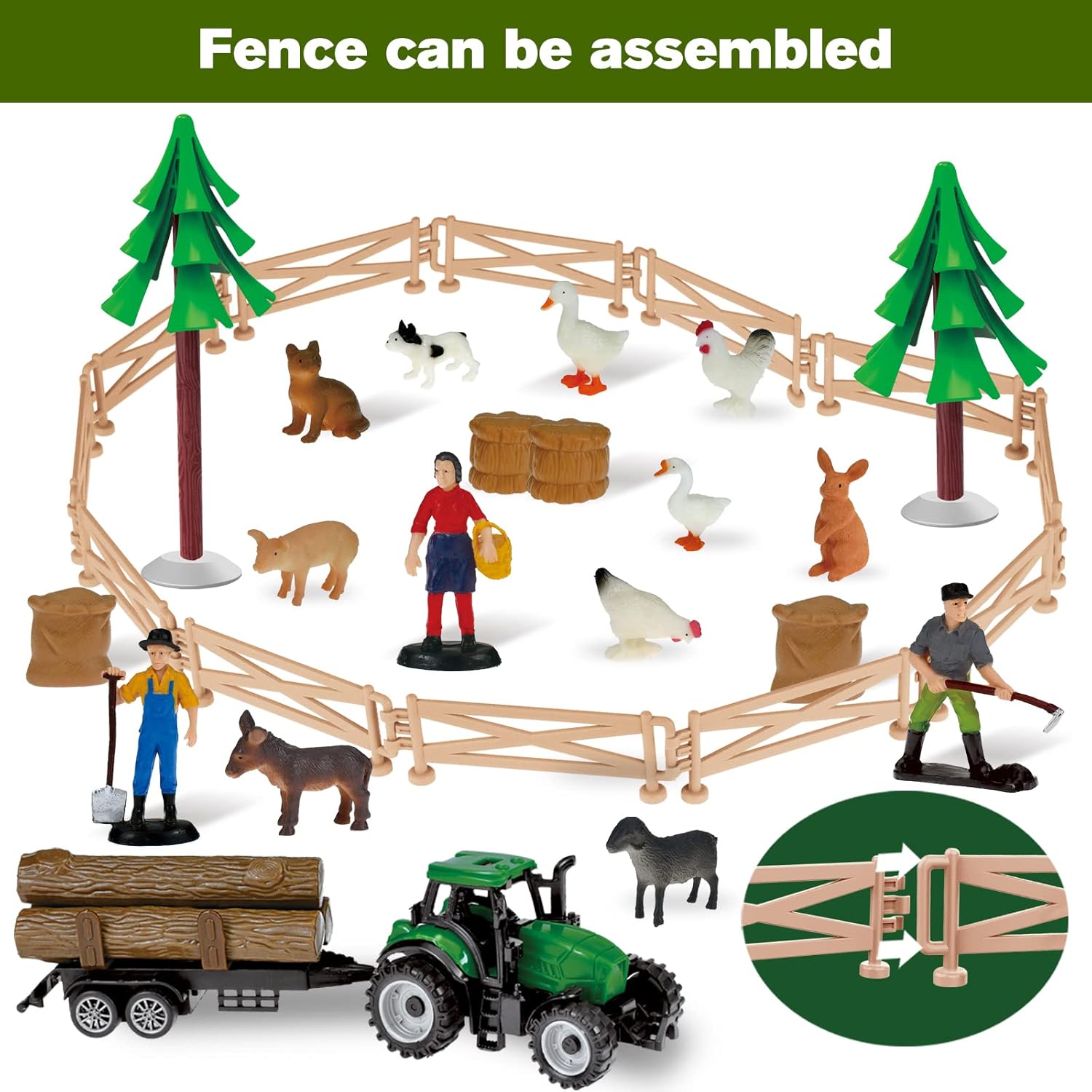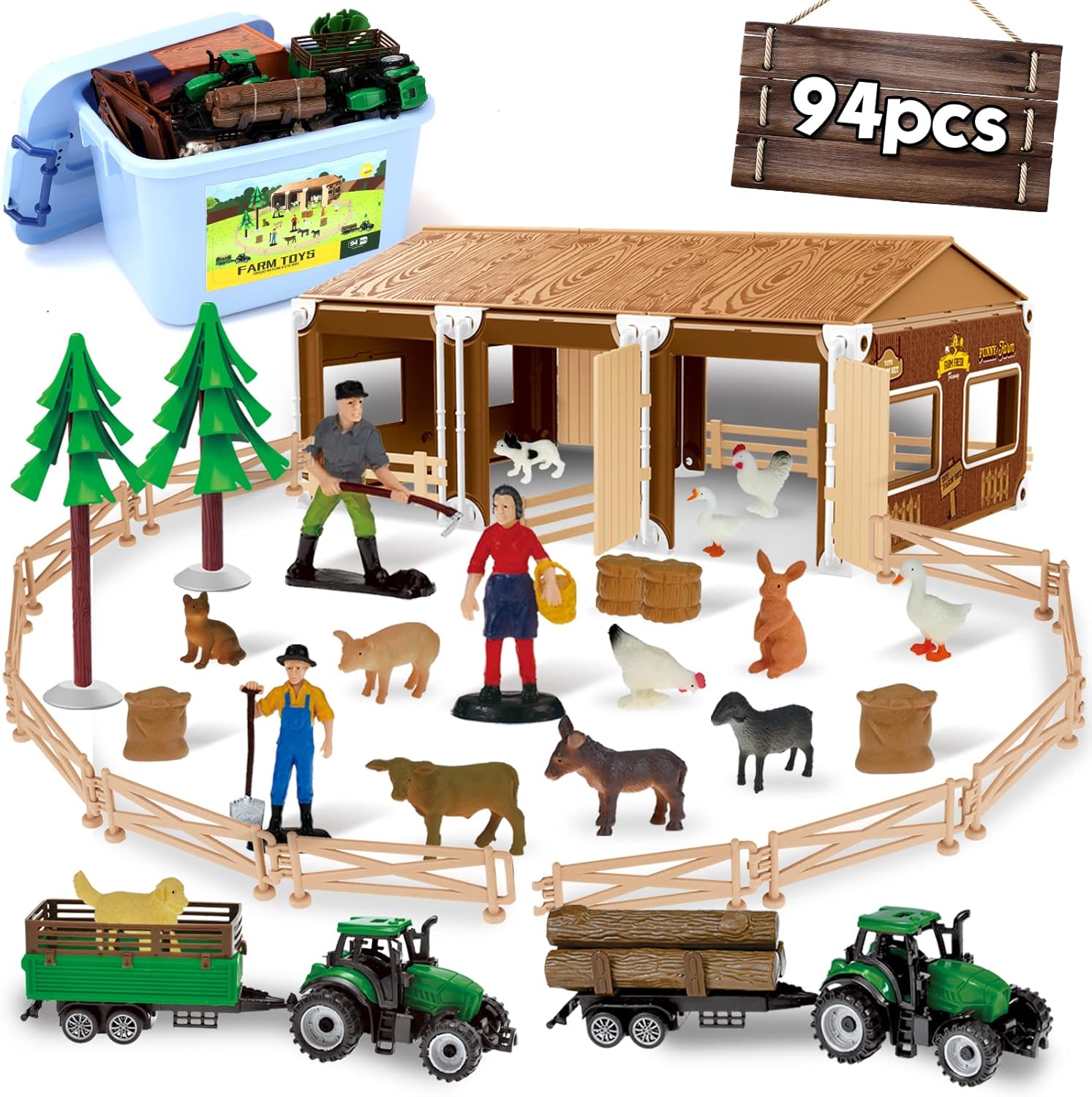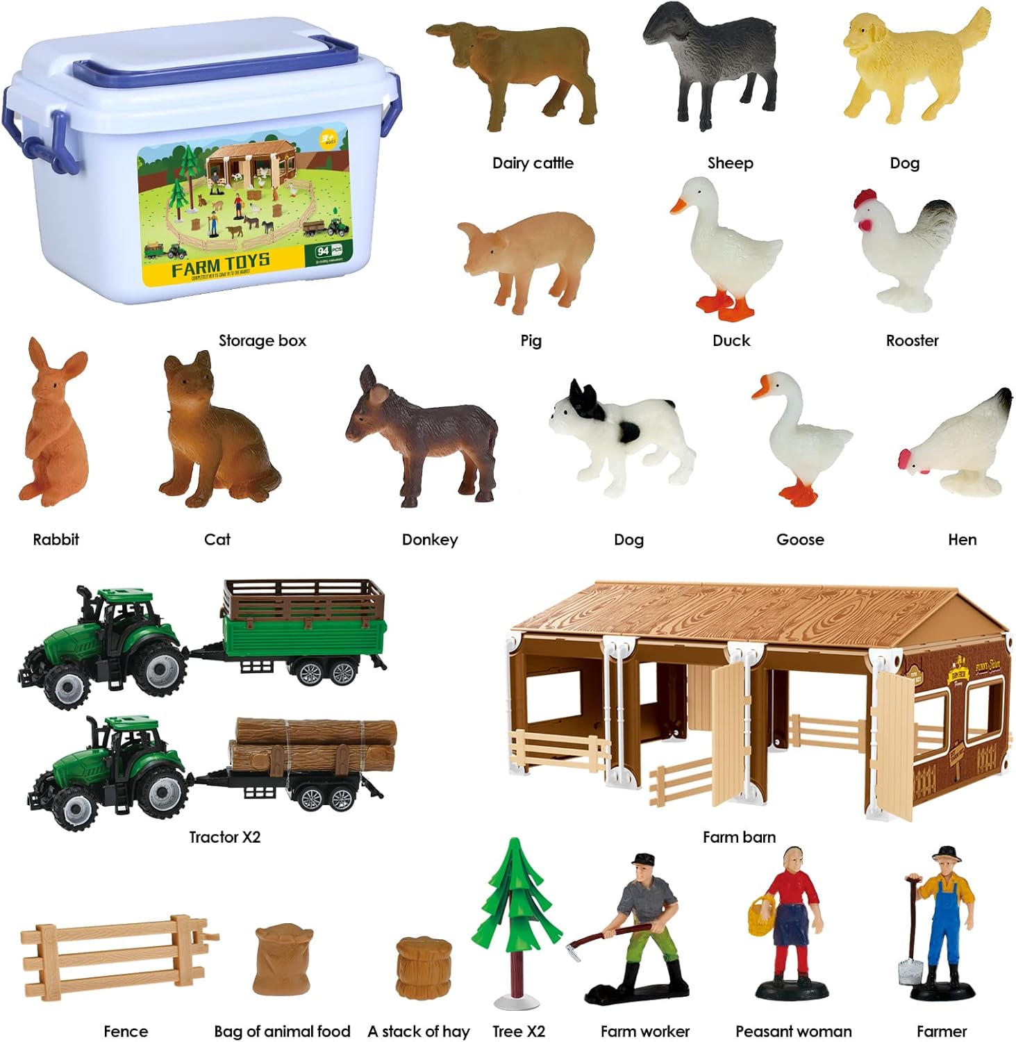 - 94PCS Farm package: One set of unassembled toy farm barn (12 farm animals,1 house, 16 fences, 2 trees, 1 farm worker, 1 farmer, 1 peasant woman, 2 tractors, 1 storage box and other accessories ),your children can spend long hours in exploring and building the farm animals world.