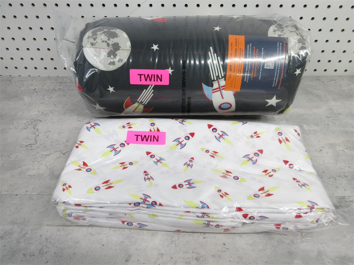 AMAZON BASICS KIDS 5PC BEDDING SET TWIN Easy-Wash Microfiber Bed-in-a-Bag Bedding Set - Twin, Space Rockets