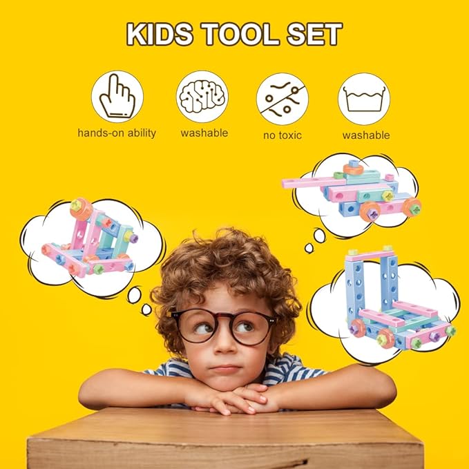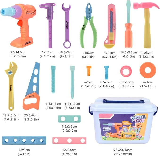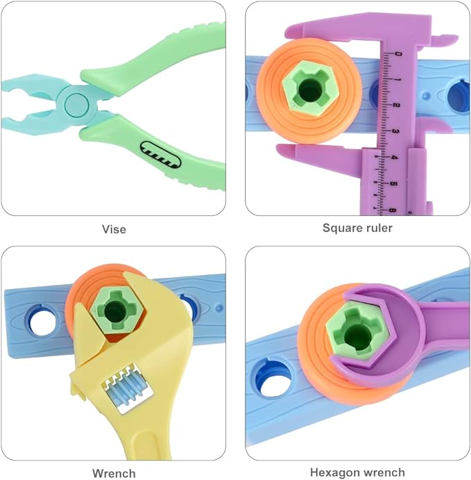 • 【Kids Tool Set】Unique designed candy-colored 79pcs kids pretend play toy tool set includes toy electric drill, hammer, knife, wrench, screwdriver, vise, square ruler, hexagon wrench, saw, screw and construction panels. The screws can compose different shapes, and your child can play as you like!