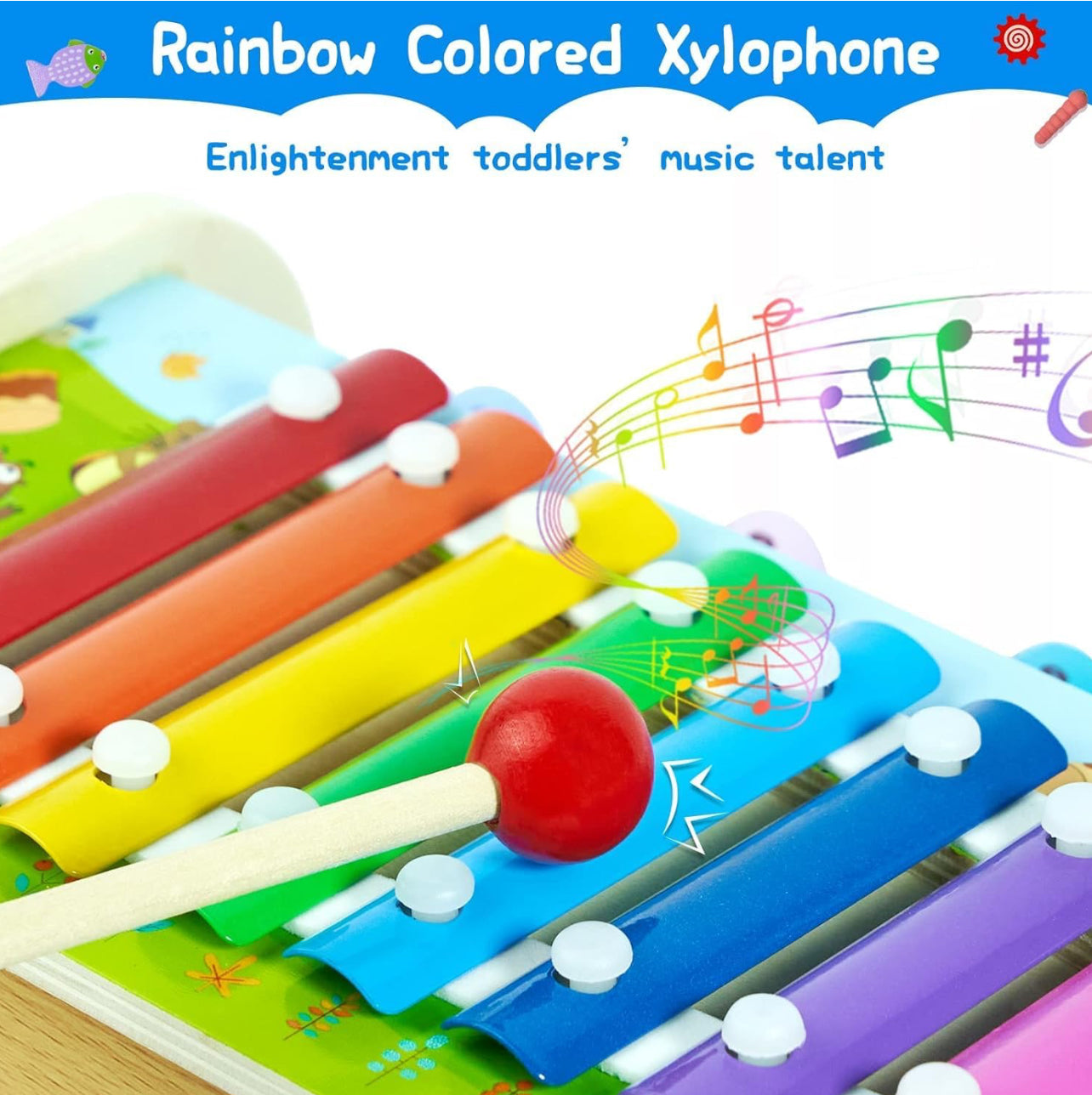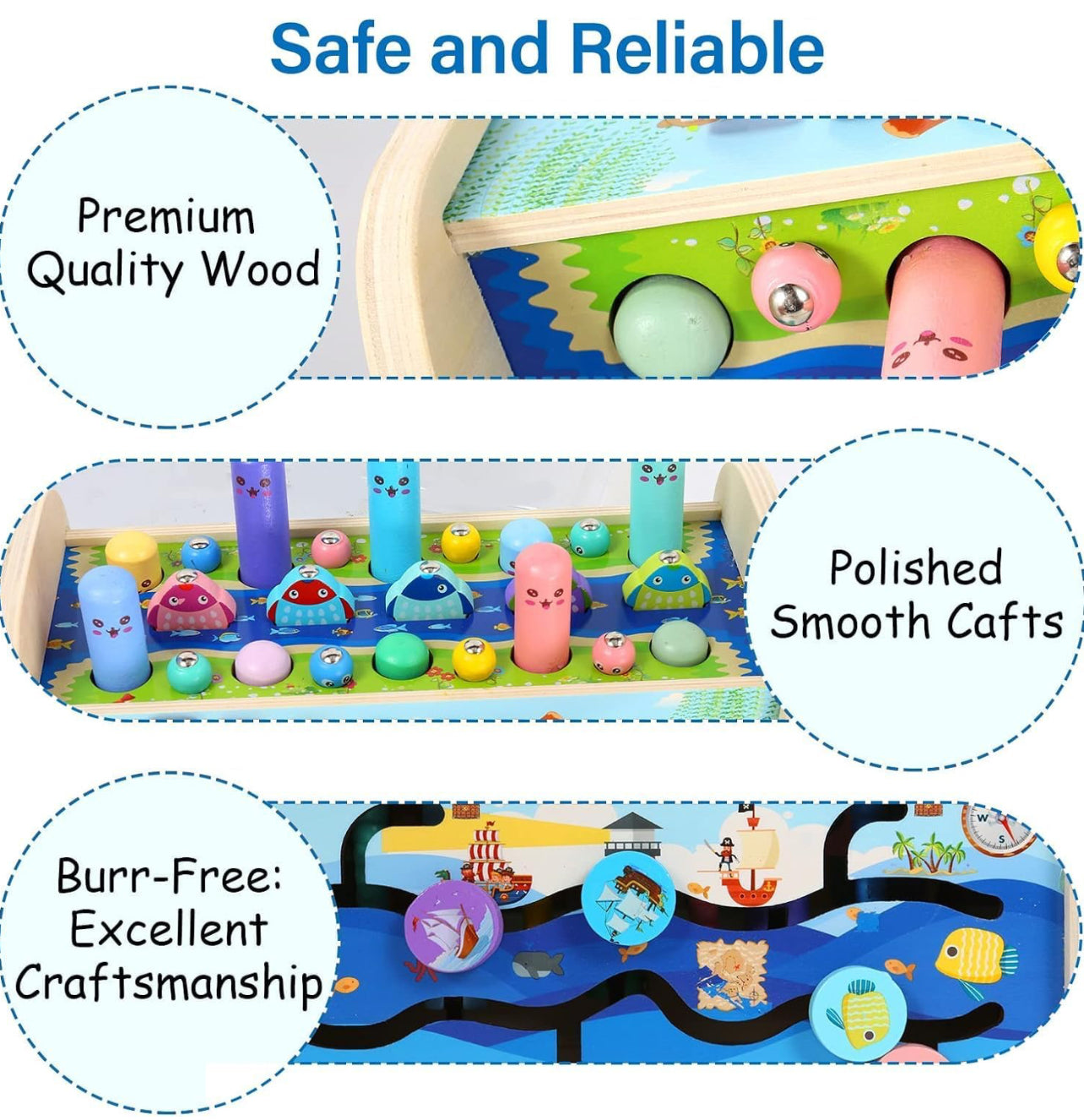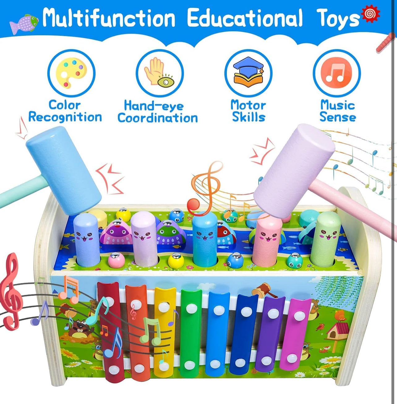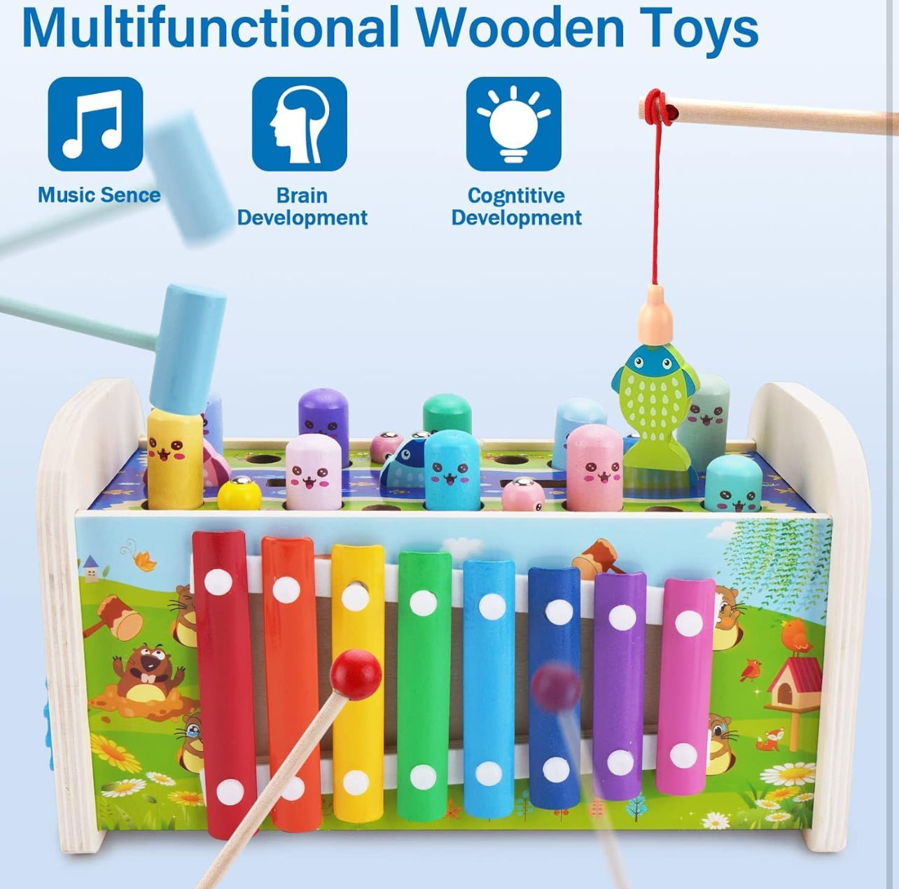 - 👶Versatile 7-IN-1 Montessori Toy for Toddlers: Experience the joy of learning and play with wooden Montessori toy, offering 7 engaging activities: whack-a-mole game, musical xylophone, fishing game, worm-catching, learning clock, spinning gears, slide maze game, and sorting and stacking puzzle. Your child will be fully immersed, avoiding boredom, saving you money, and resolving storage challenges.