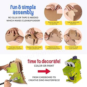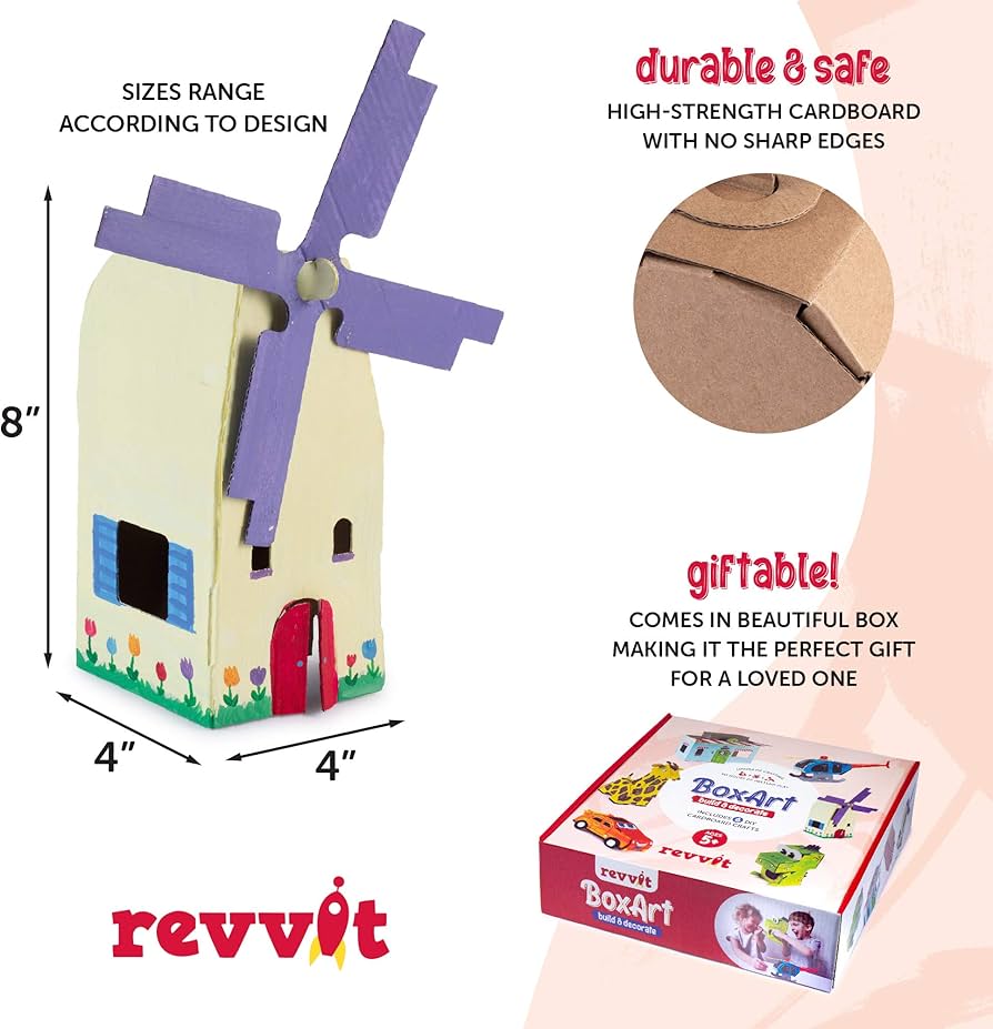 BoxArt Cardboard Crafts for Kids to Build & Color or Paint - Arts and Crafts DIY Imagination Play - Includes Dinosaur, Helicopter, Giraffe, Building, Windmill and Race Car.