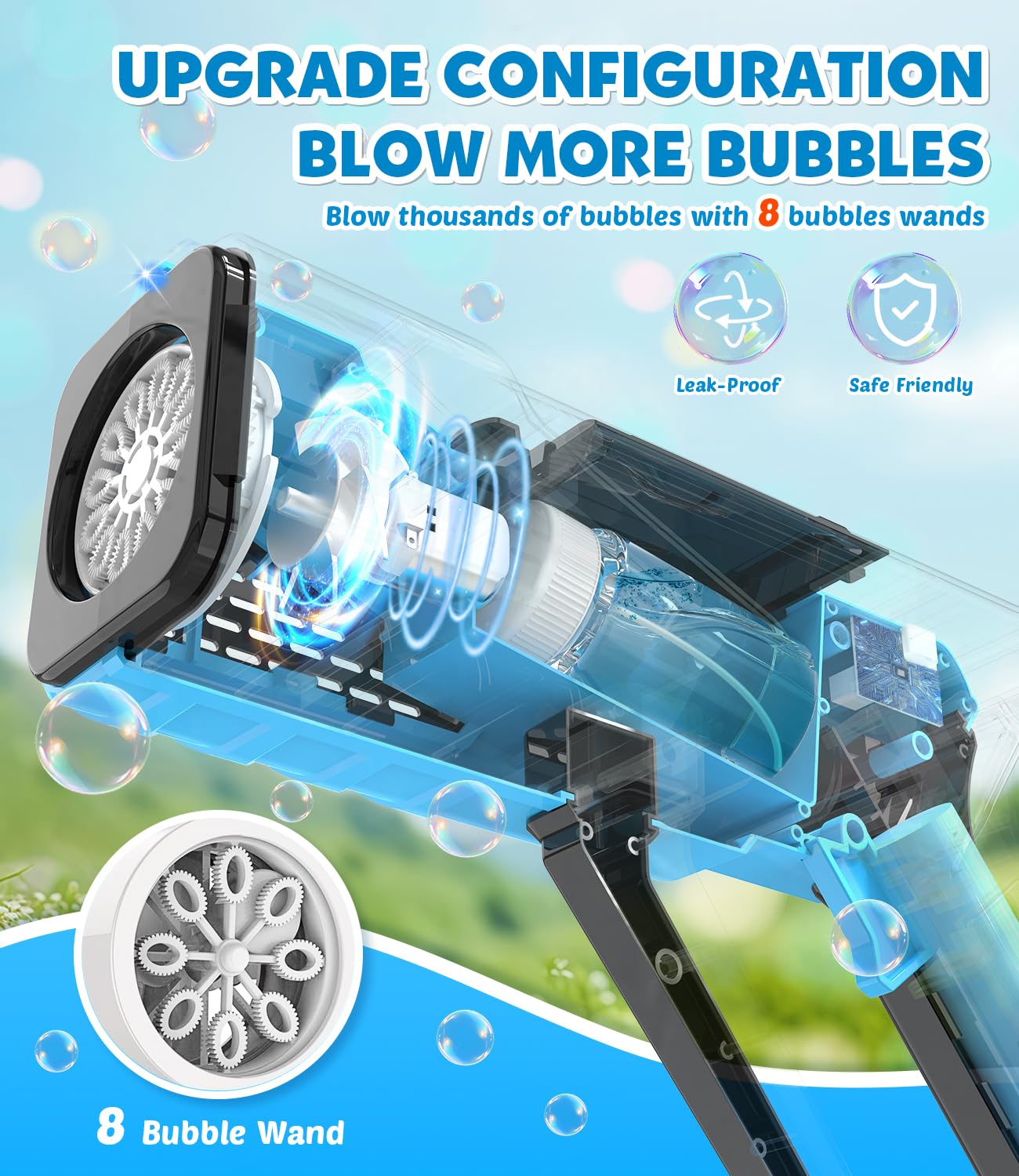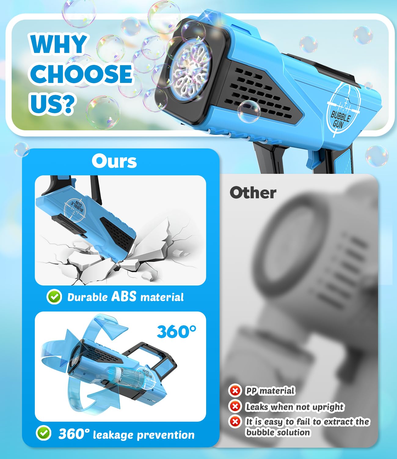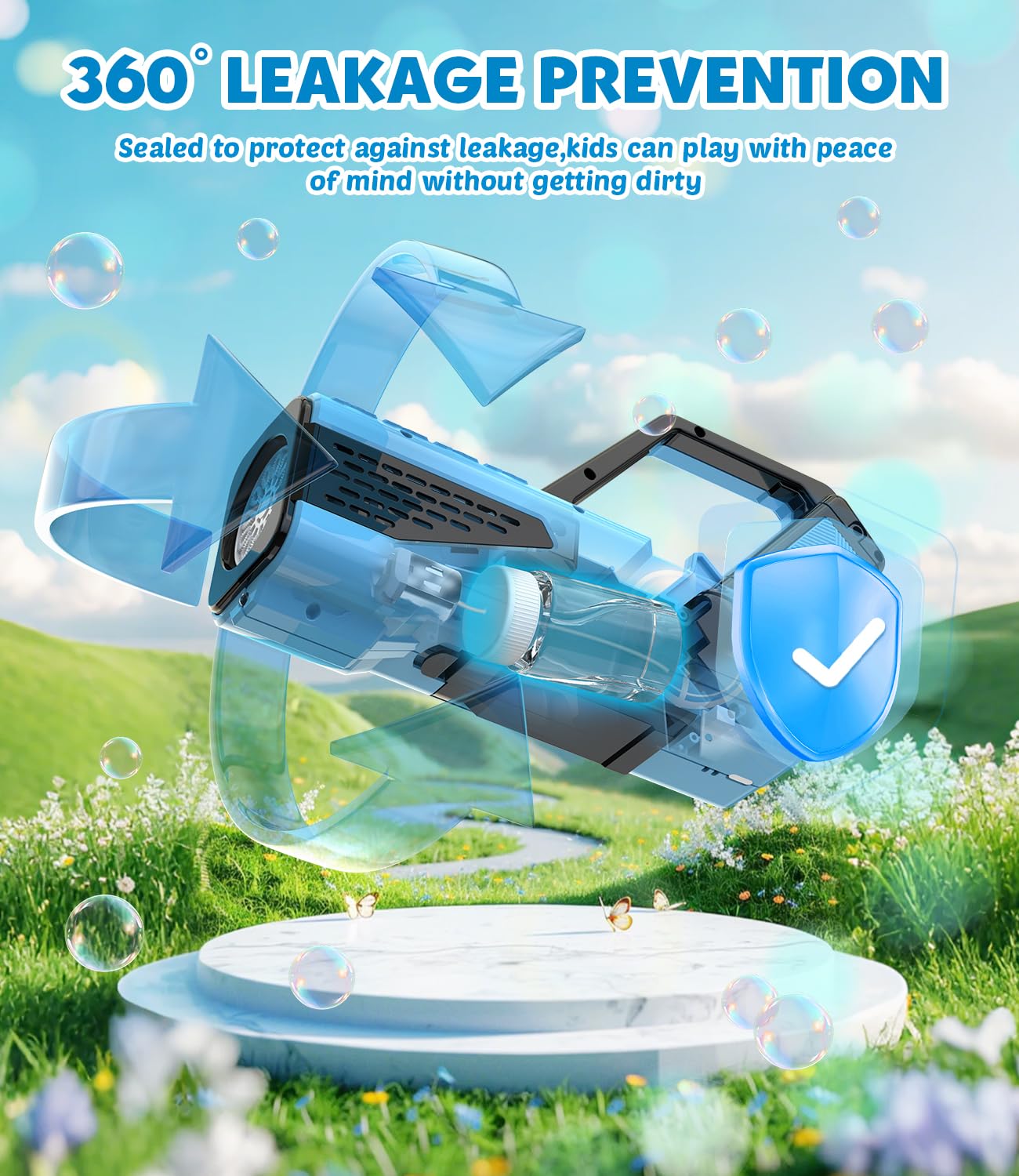 - 【LEAK-PROOF & ERGONOMIC】- We built the solution bottle into the bubble gun to keep it leak-proof. You don't have to worry about your child sticking to your body or hands. Easy to hold and use, one-button bubble. Safe and worry-free.