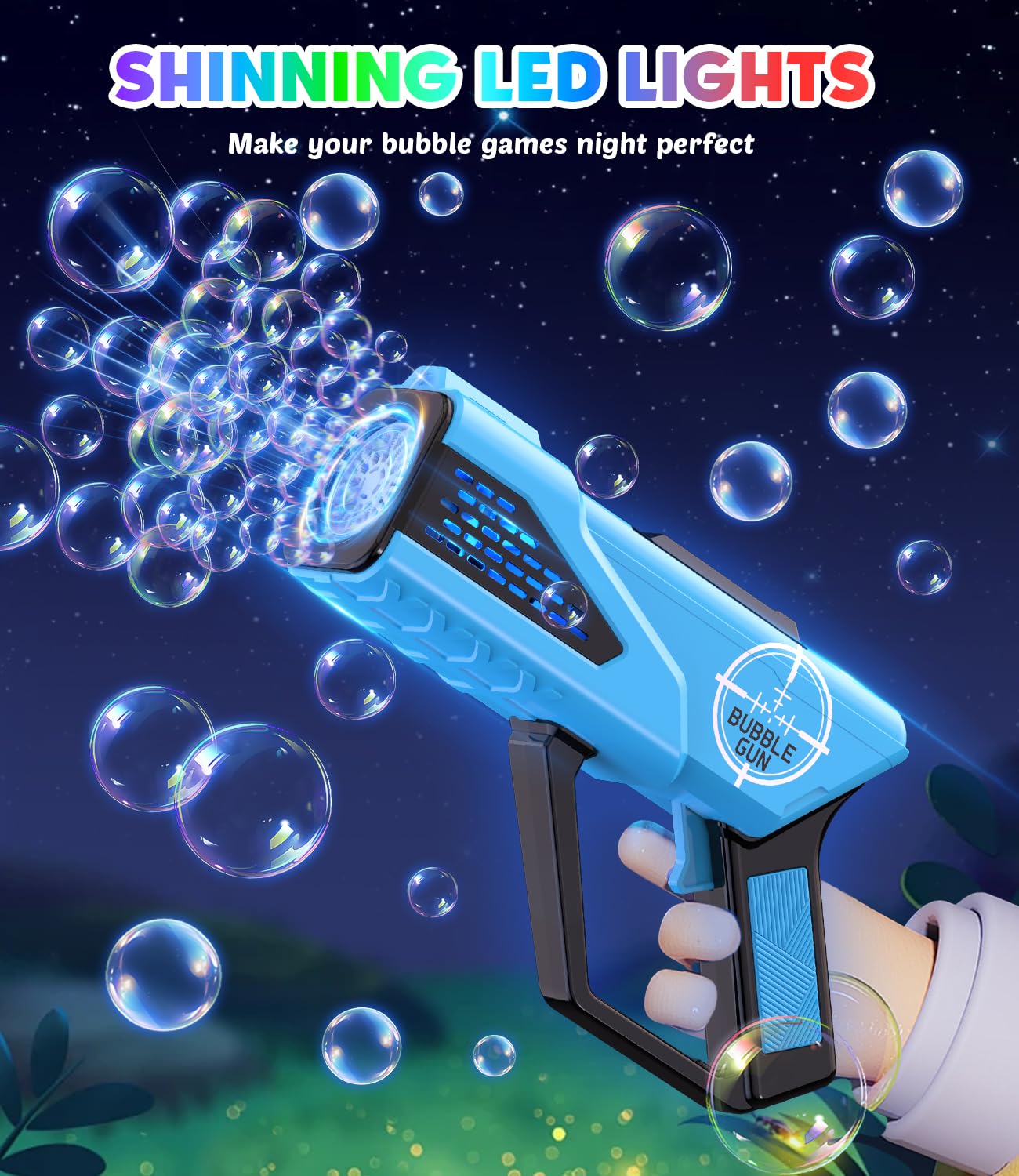 - 【POPULAR CHOICE】- Joyfuture bubble gun has a powerful motor and 8-hole bubble wand, blowing thousands of bubbles per minute, instantly creating a dreamy bubble ocean. Equipped with LED lights, it is suitable for various celebration occasions. Light up the happy time, especially at night.