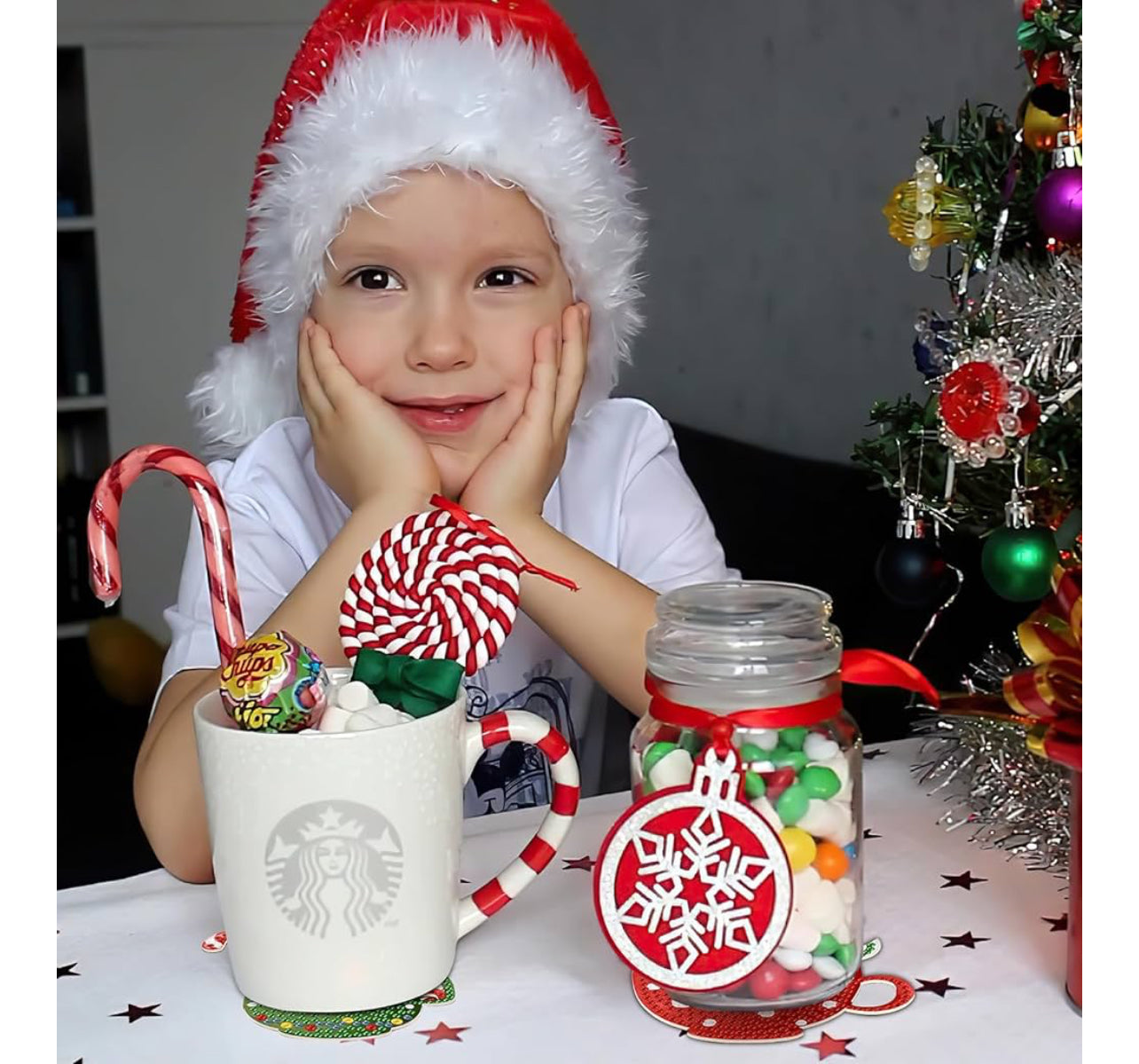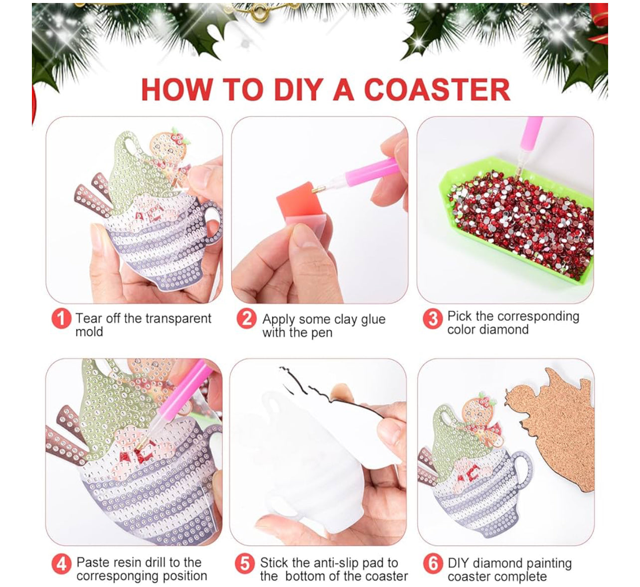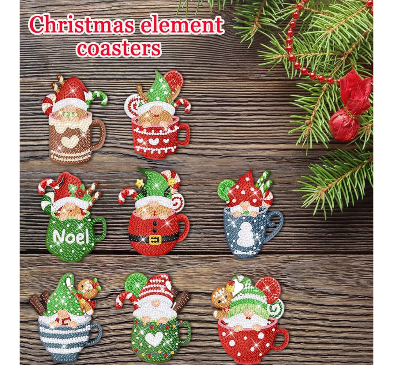 - Christmas Diamond Coasters Kits: You will get 8 christmas diamond painting coaster Kit, including 8 coasters with cork stickers, 1 coaster holder, 1 diamond pen, 1 diamond tray, 1 clay glue and enough number of molded diamonds to make the table decor cute and shiny