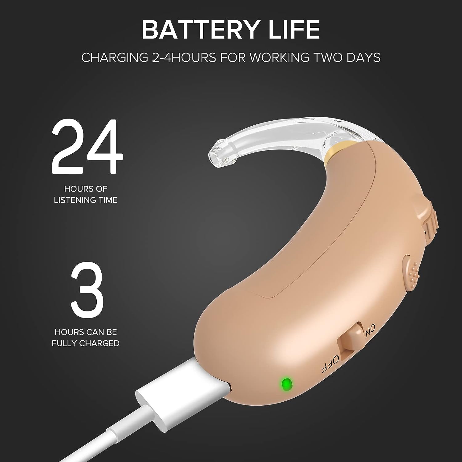 • This Is a USB rechargeable hearing amplifier, so you don't have to buy extra the button battery. It Can Work For 48 Hours After Charging For 2-3 Hours.