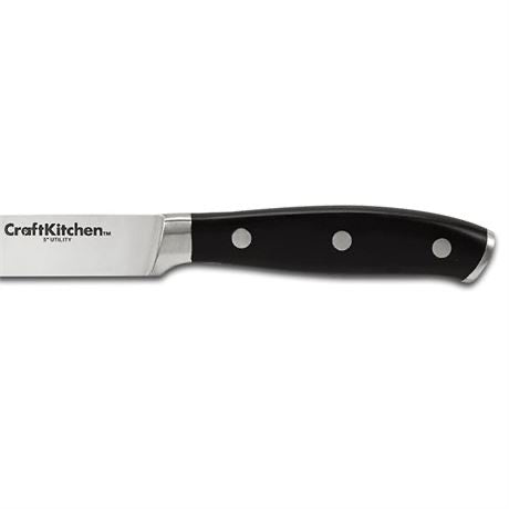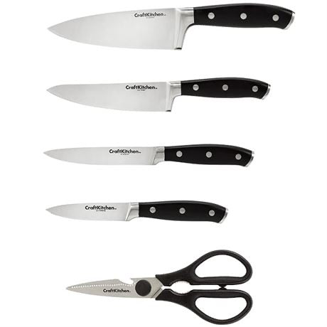 • Set includes 6” cooks knife, 5.5” prep knife, 5” utility knife, 3.5” paring knife, kitchen shears, and wooden knife block.