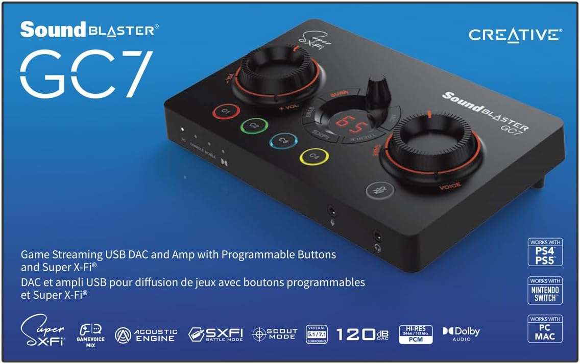 - DUAL DSP WITH INCREDIBLE AUDIO PROCESSING | Equipped with both Super X-Fi and Sound Blaster audio technologies, the Sound Blaster GC7 offers you top-tier audio processing capabilities. Immerse in the hyper-realistic audio holography from Super X-Fi that recreates the soundstage of a multi-speaker system in your headphones; or experience Sound Blaster’s full suite of audio enhancements that has been fine-tuned over 30 years, and customize your audio to your liking for both speakers and headphones