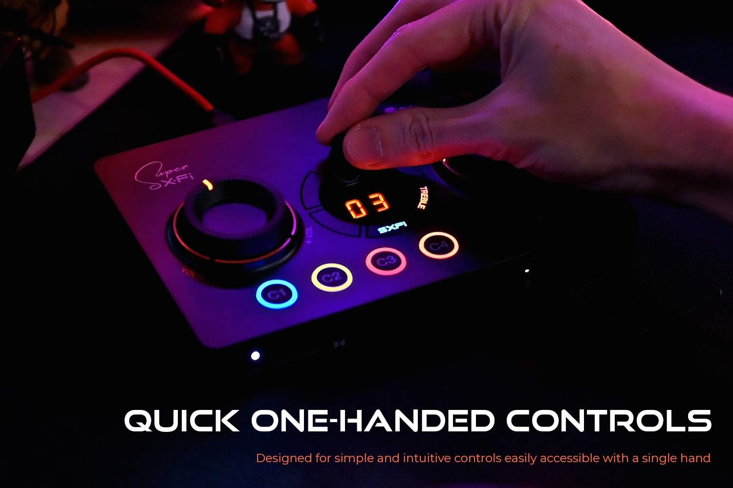 - ON-THE-FLY CONTROLS WITH PROGRAMMABLE BUTTONS | The Sound Blaster GC7 is ergonomically designed with simple and intuitive one-handed controls for quick adjustments on the fly. It also comes with 4 fully programmable buttons that you can customize with your favorite audio profiles, or program your own macros for some quick maneuvers during a live stream. You can even customize it further with your preferred RGB lighting colors to match the device colors with the rest of your setup