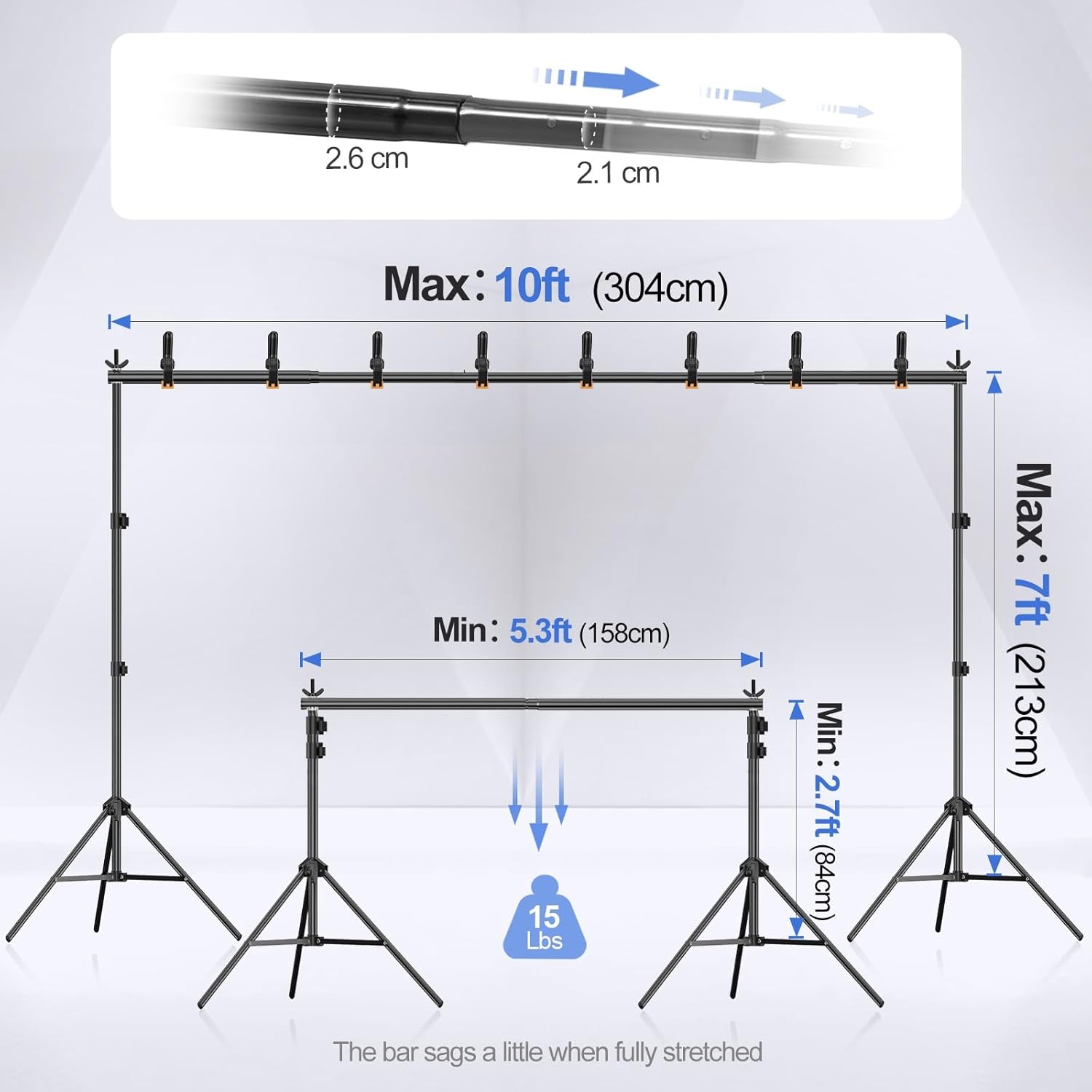 • 【Sturdy Tripod Backdrop Stand】 With adjustable height (2.6ft/0.8m–7.0ft/2.1m) , the aluminum alloy backdrop stand is durable, and the design of the tripod base ensures it won’t shake when fully extended to its maximum size.