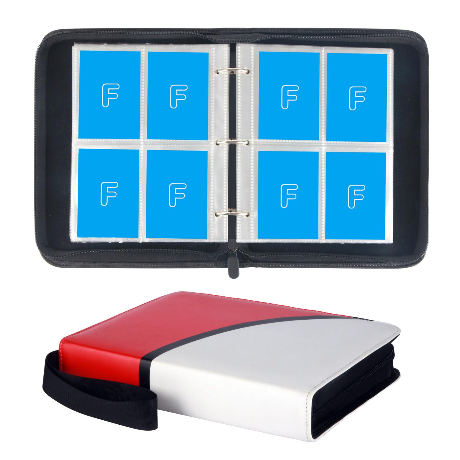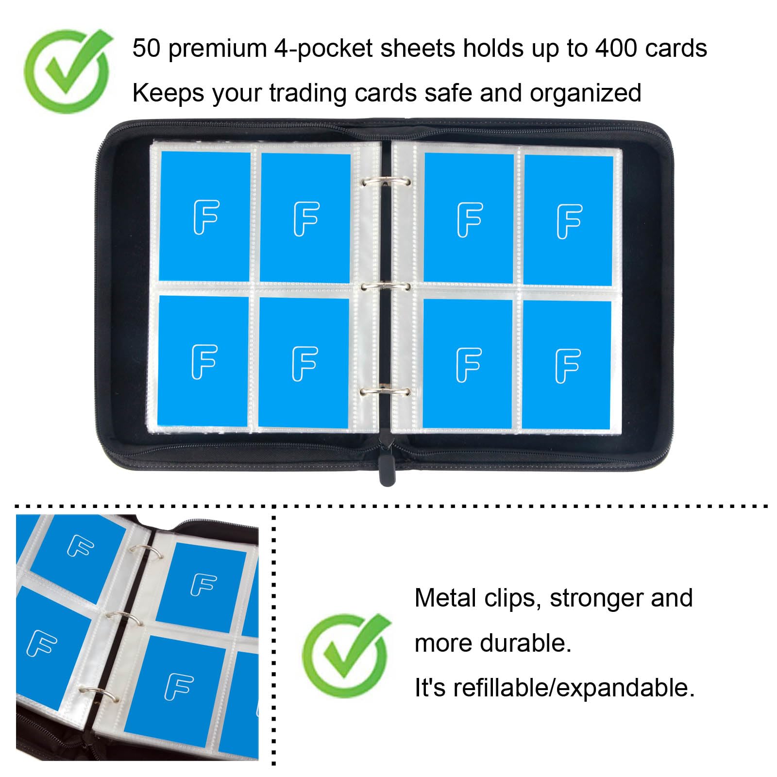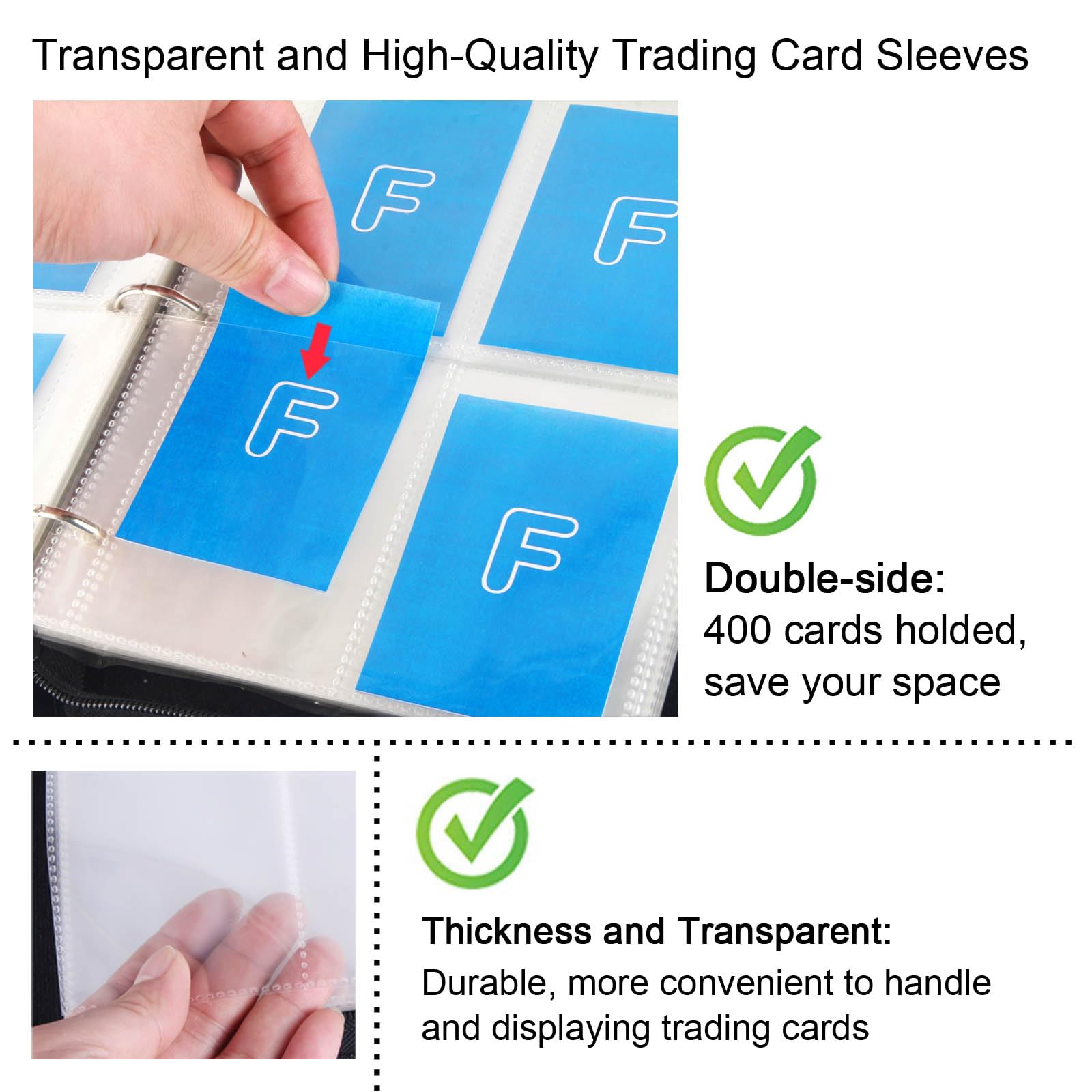 - 【High Capacity Card Case】Our card holder book has 50 pages of double sided 4-Pocket card sleeves, the separate card slots on each side of the page, holds 400 cards, and because of the three rings you can always add more.