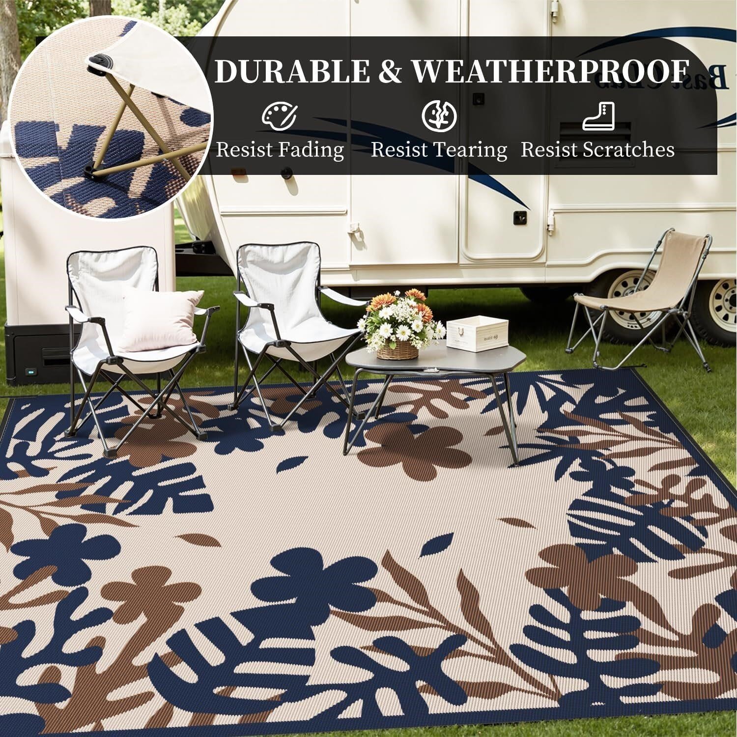 Durable Material & UV-Resistant: Crafted from plastic straw, this floral outdoor rug is both durable and lightweight. The outdoor camping mat boasts fine stitching, tidy edges, and keeps the rv outdoor rug non-fading, vibrant even in prolonged direct sunlight. The outdoor rugs are perfect for barefoot walking, lying, and sitting.