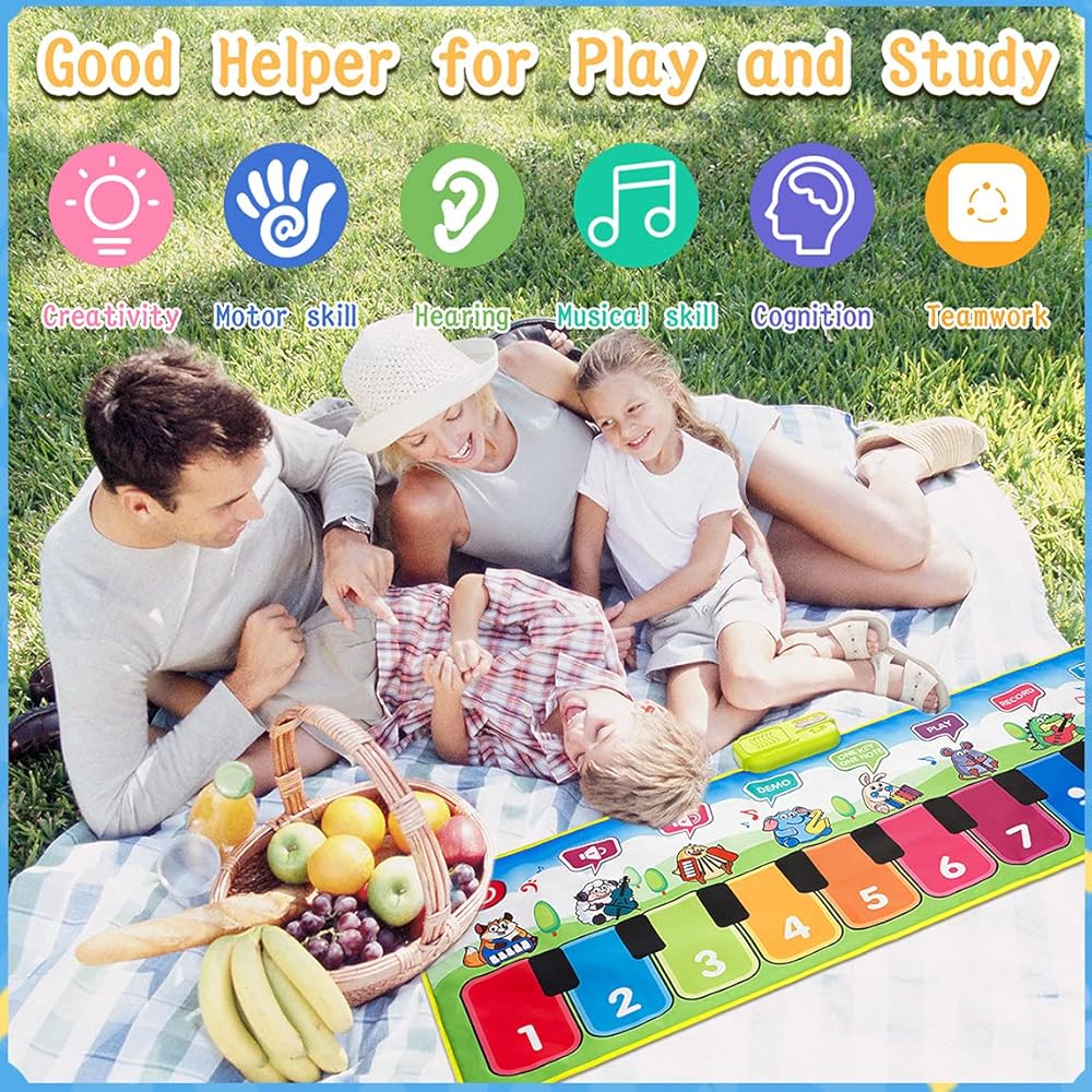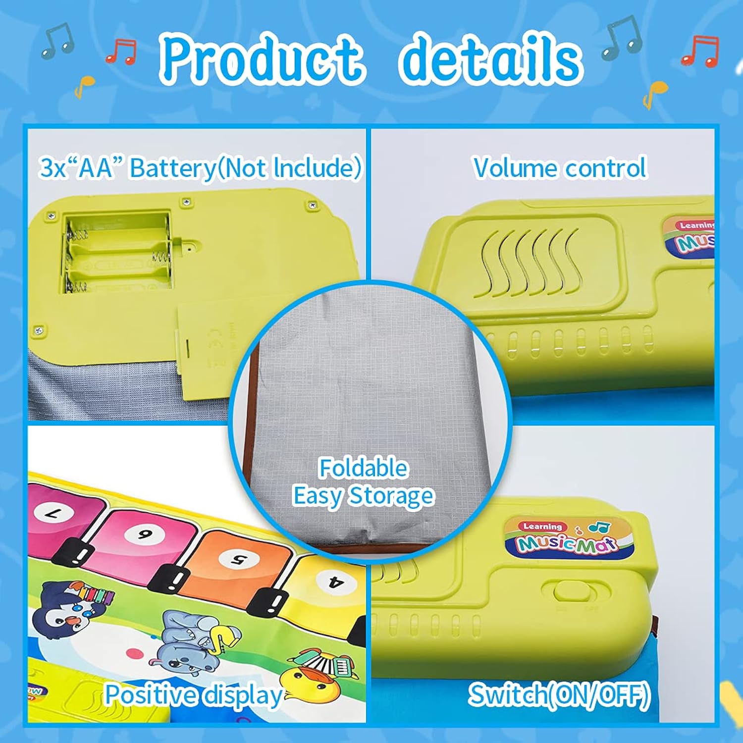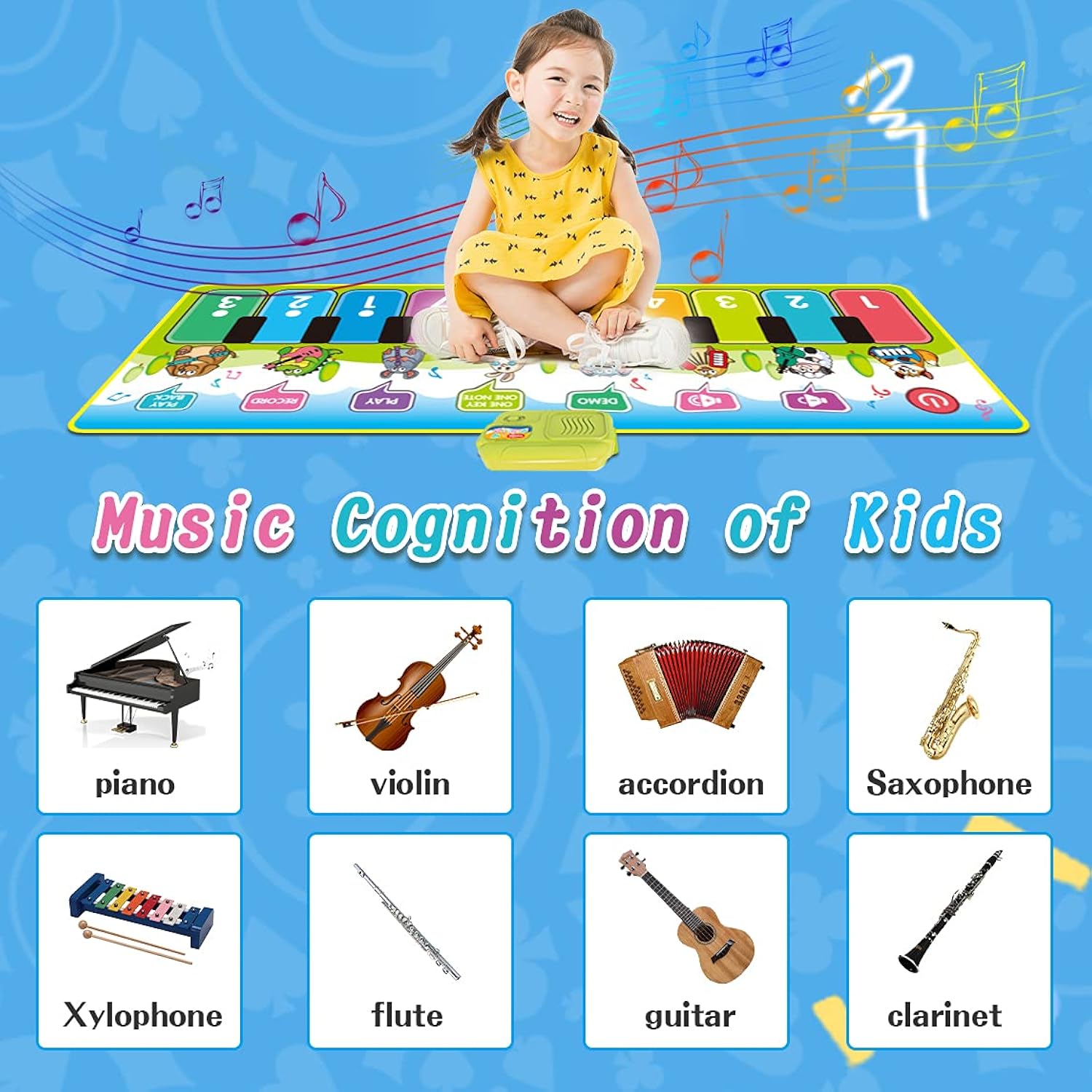 - 1,Popular Musical Piano Mat: It is a perfect early childhood education toy. Music mats are very suitable for cultivating children's cognitive interest in music, attracting children's attention, and helping kids identify colors, musical instruments, animals and piano keys. Kids can dance while standing or touch with their hands to improve their hand-foot coordination, promote their exercise while playing on the mat, and combine education with entertainment.