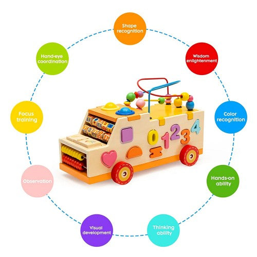 The 5 in 1 Multi-Activity Vehicle can be played as a bead maze truck, shape sorter toy, crawling toy, hammer toy, and abacus. Help strengthen your baby's ability to recognize shapes colors, numbers. exercise logical thinking and mathematics skills at an early age. This lovely and stylish activity center for toddlers encourages exploration and imaginative play and offers them hours of fun and learning time.