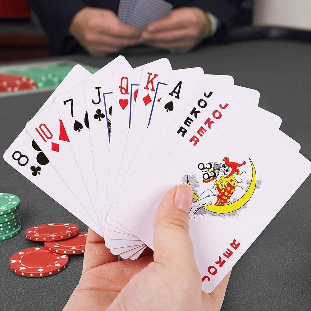 12 Decks Playing Cards Pack, 6 blue and 6 red Each deck contains 52 suited cards and 2 jokers Plastic-coated decks of cards for a smooth feel and extra durability, made from paper stock with blue core construction, nearly Casino Grade Playing cards are great for all card games: bridge, go fish, poker, euchre, hearts, blackjack, canasta, texas, pinochle, baccarat, casino night and more Poker size with standard index: cards measure 2.5" x 3.5"