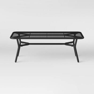 It's easy to pull together your outdoor space with the Metal Mesh Patio Coffee Table from Room Essentials . This outdoor coffee table has a simple yet striking look with its solid black metal frame supporting a metal mesh-detailed tabletop. The basic black color makes it easy to incorporate into any color palette, whether you arrange it as a complement to neutral-hued seats or as a contrast to bright, bold colors. A 40-inch tabletop makes it great for entertaining, providing plenty of surface space for snacks, beverages and even board games, and a fade-resistant finish helps it maintain its look. Highlights: Metal coffee table makes striking addition to outdoor space Black metal frame with mesh detailing for a simple, chic look Fits a wide range of aesthetics Fade-resistant finish keeps it looking its best 40in tabletop provides plenty of space for snacks, beverages and board games Specifications: Features: Rectangle (shape) Dimensions (Overall): 14 Inches (H) x 20.08 Inches (W) x 40 Inches (D) Weight: 14.64 Pounds Material: Steel (Frame) Finish: E-Coating Tabletop Material: Steel Assembly Details: Adult Assembly Required, Tools Provided Protective Qualities: Fade-Resistant Frame Color: Black Tabletop Thickness: .9 Inches