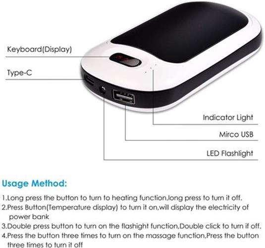 • Long Lasting Battery - The rechargeable hand warmer has a built-in 7800mAh lithium ion battery allowing for up to an 8 hours use. If fully charged, you will be able to charge your phone 1-2 times. There is a Tri-level indicator to remind you of the remaining battery.
