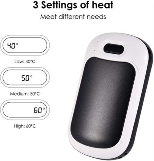 • 3 Heat Settings- As a hand warmer, the device has 3 levels of heat with a temperature display. Heat settings can be set to 104°F(40°C), 122°F(50), or 140°F(60°C). The device heats up in seconds providing you with much needed warmth.