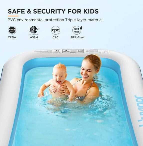 • ENSURE LONG LIFE SPAN: The blow up pool is made from 0.41mm thickness, puncture-resistant PVC material, 55% thicker than most in the market, making it durable enough to last far beyond the Fourth July. The texture of thickening bottom prevents falls. Made with skin-friendly material ( BPA-free, CPSIA, CPC and ASTM certificates ) for your family’s skin safety.