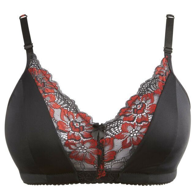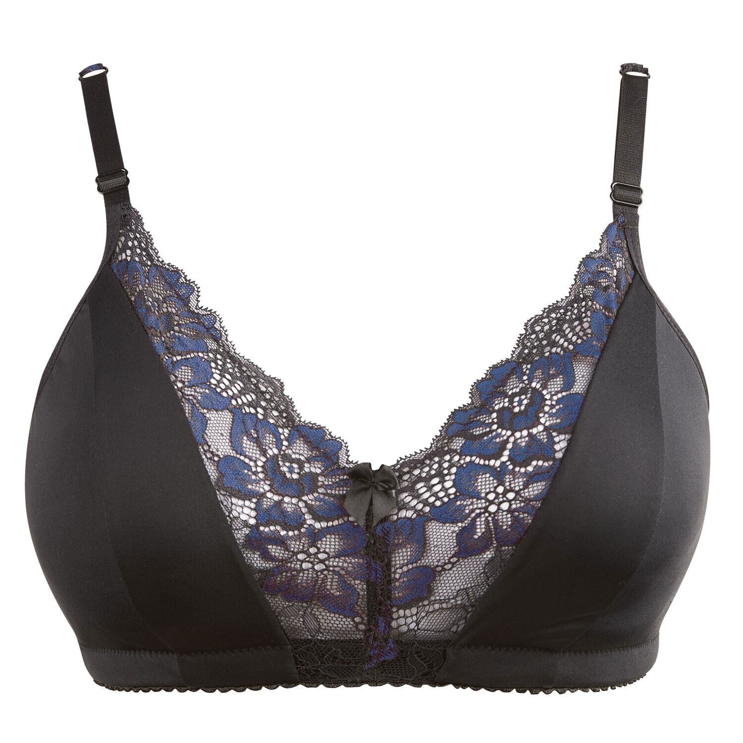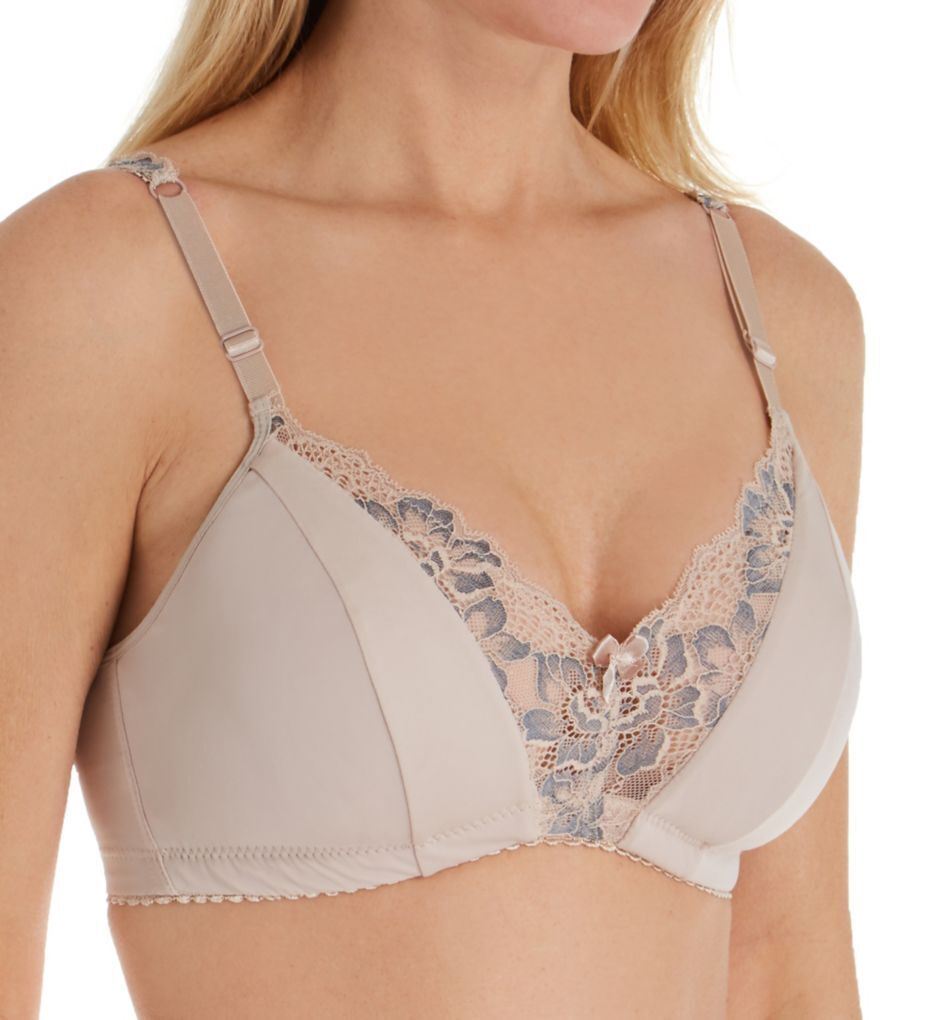 The Rhonda Shear Soft Cup Leisure Bra 680 has wire-free padded cups, cross-dyed floral lace accents, a stretch microfiber body, and straps that adjust at front.