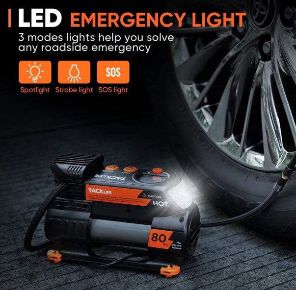 • Power Required: Only supports a 12V-DC cigarette lighter socket plug. This TACKLIFE Orange portable air compressor offers a working voltage of 12 volts DC, maximum amperage of 10 amps, and maximum working pressure of 80 PSI.