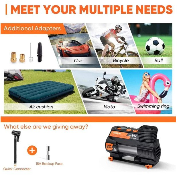 • Meet Your Multiples Needs: This 12V tire pump comes with 4 additional adapters, capable of inflating tires on cars, bikes, motorcycles, balls, balloons, and other inflatables. DOES NOT SUPPORT Truck Tires, SUP, Kayak, Family Swimming Pool.