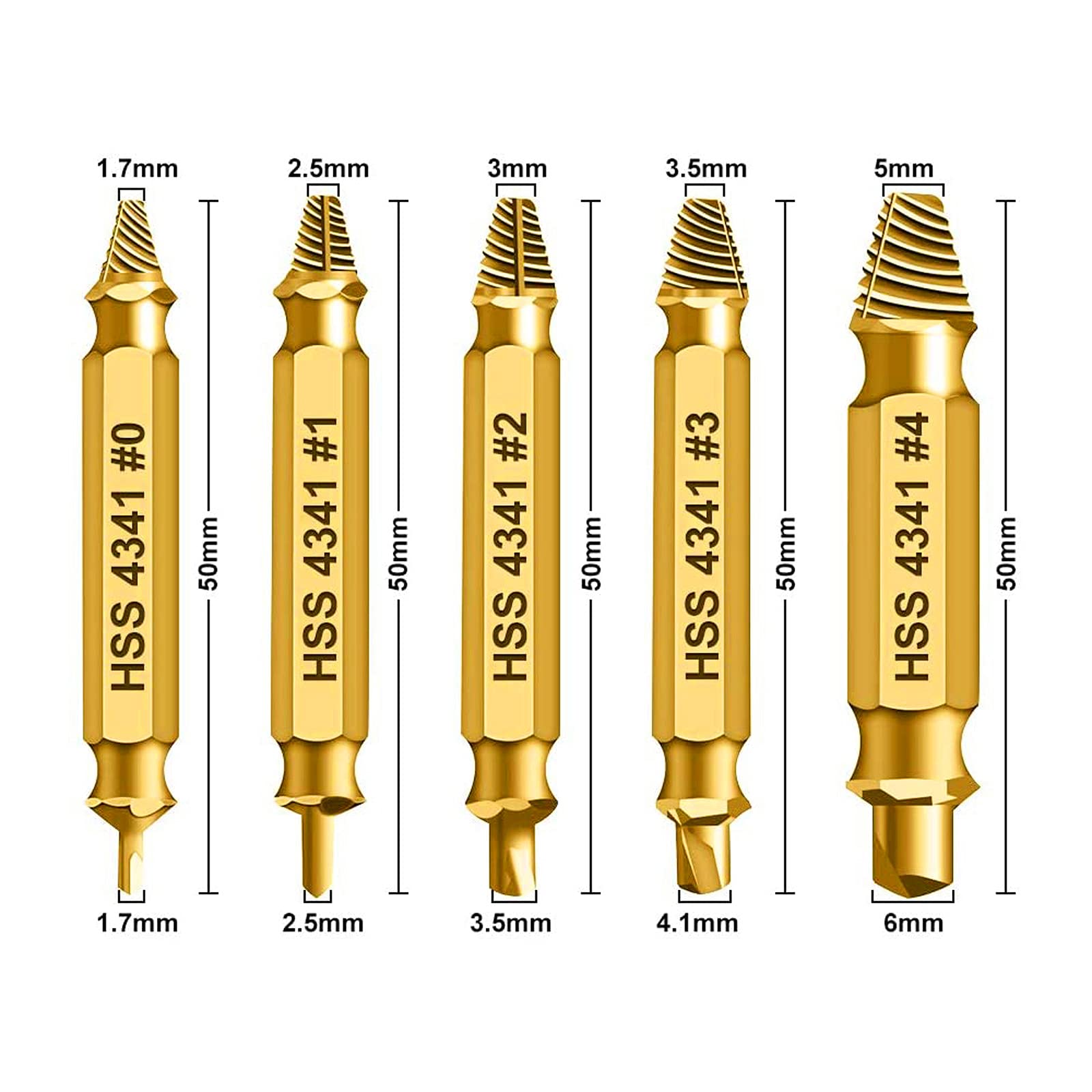 - EASY IDENTIFICATION: Each extractor clearly marked with size (HSS 4341 #0 to #4) for quick selection of the appropriate tool