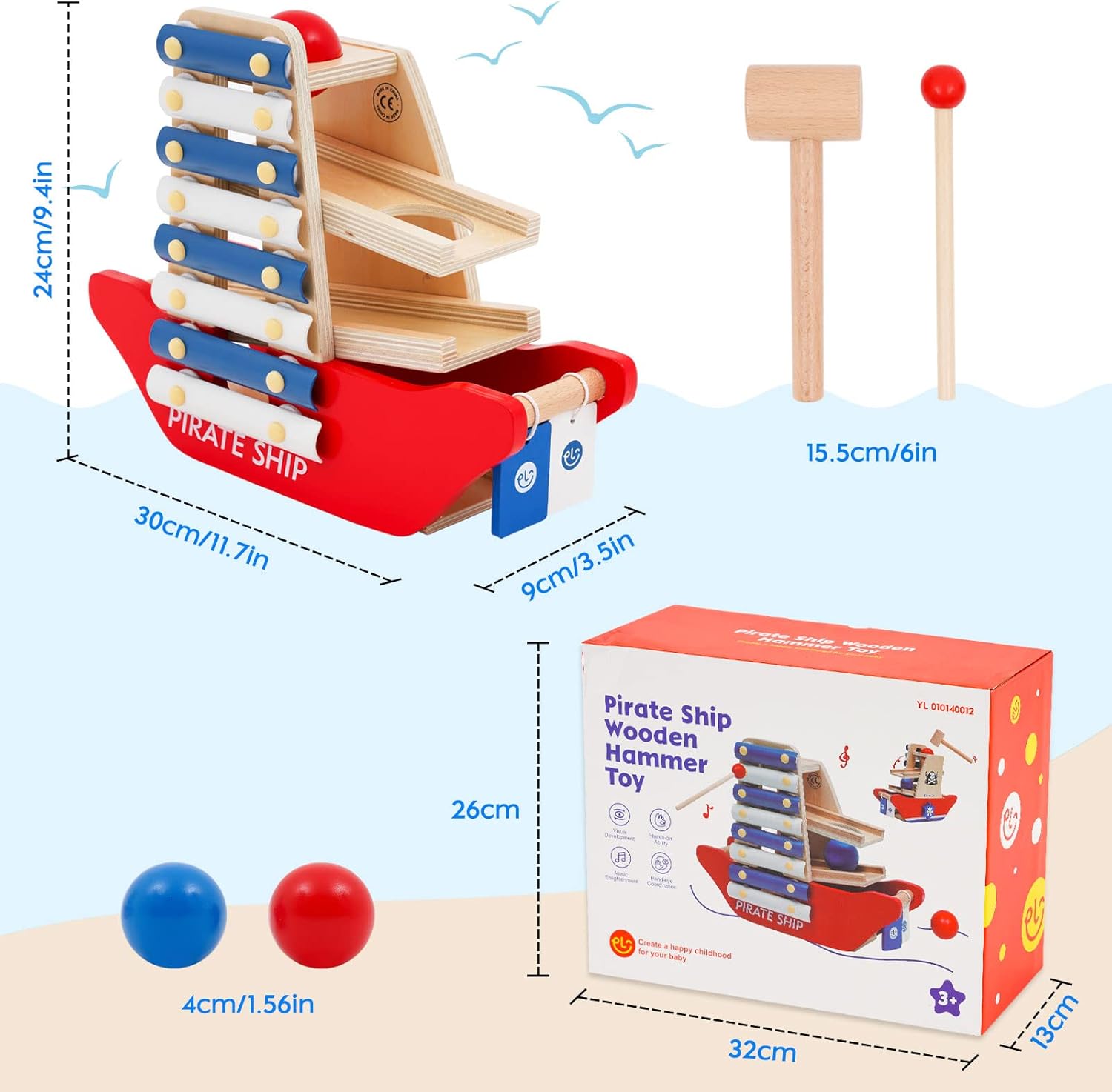 NUKied Montessori Toy from 3 Years, Xylophone and Hammer Game Toy from 2 Years, Model of a Pirate Ship Wooden Toy, Montessori Educational Toy for Girls Boys from 2 3 4 5 Years