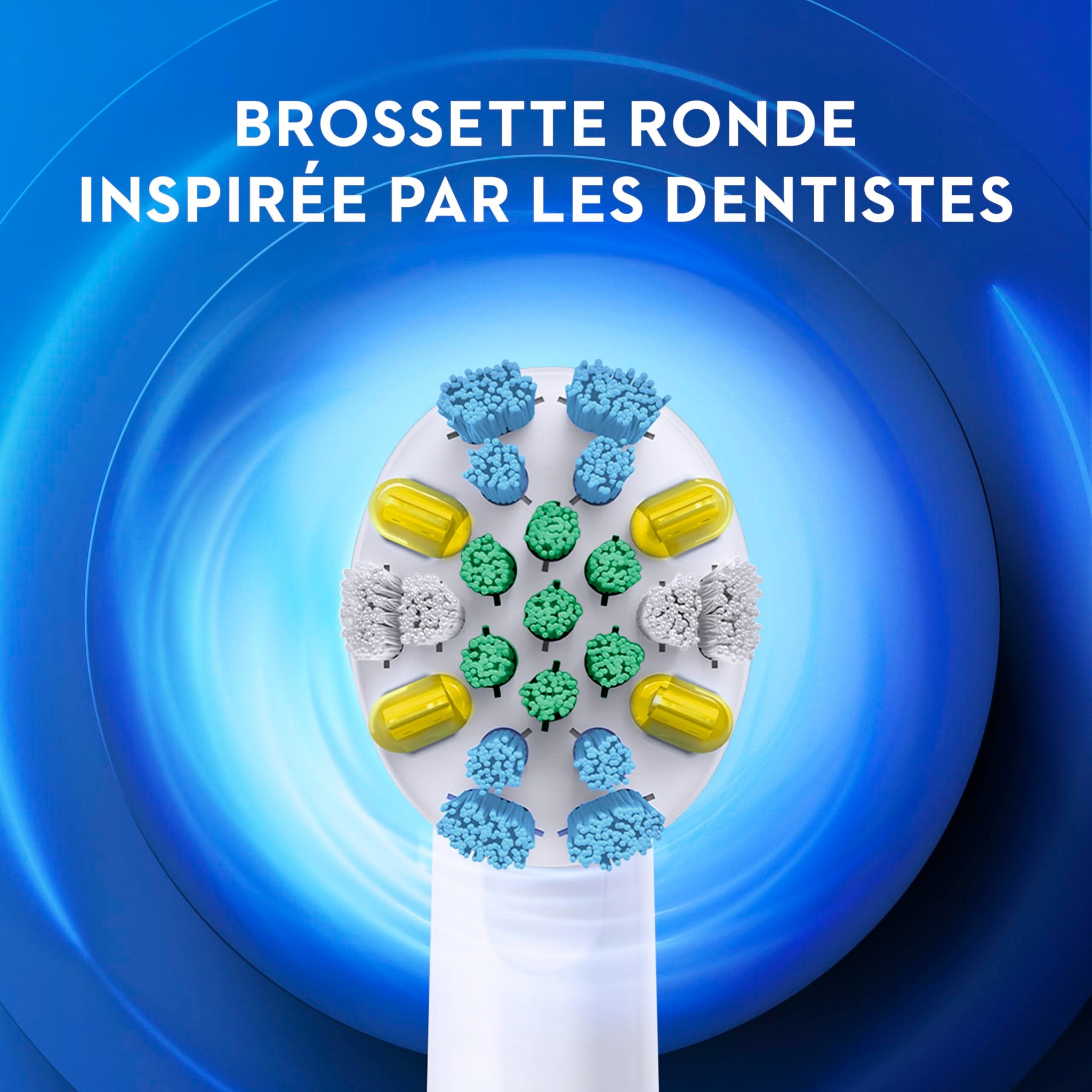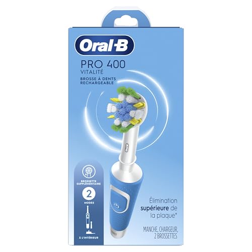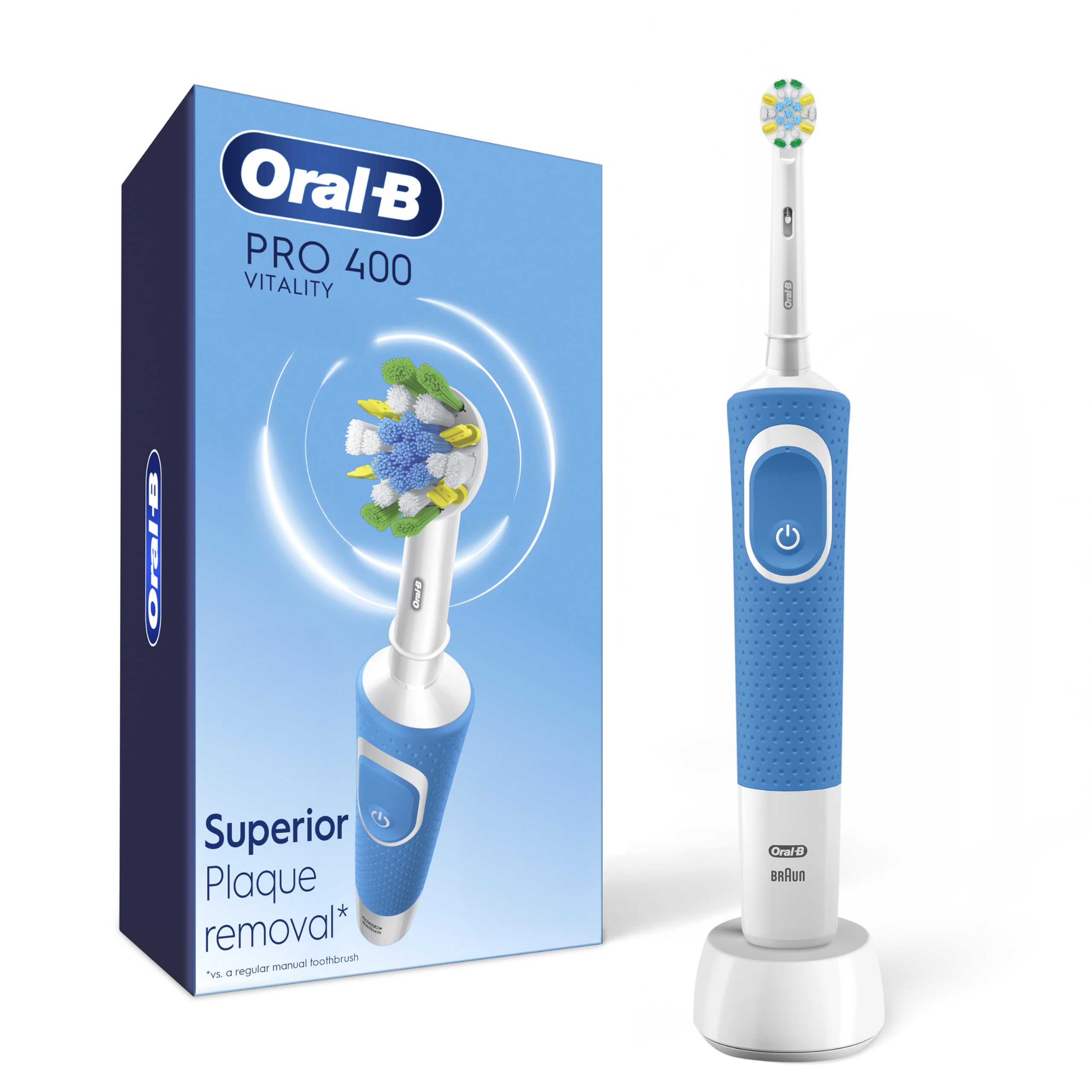 Details: The Oral-B Pro 400 Vitality Electric Toothbrush provides a superior clean vs. a regular manual toothbrush. The Daily Clean Mode personalizes your everyday toothbrushing experience. The Dentist-inspired round shape of the Floss Action toothbrush head is designed to clean teeth better, tooth by tooth. MicroPulse bristles reach deeper between teeth than a regular manual toothbrush. 2D cleaning action oscillates and rotates for better plaque removal than a regular manual toothbrush, and an in-handle timer helps you brush for a dentist-recommended 2 minutes. Best of all, it is brought to you by Oral-B—the #1 brand used by dentists worldwide.* *Based on surveys of a representative worldwide sample of dentists carried out for P&G regularly. Offered with a 30 day Money Back Guarantee. Please refer to Oral-B Website for terms & conditions. Do not use on children under age 3. Replace brush (head) every 3 months or sooner if brush head becomes worn.