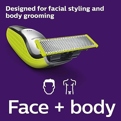 OneBlade Face + Body: a revolutionary grooming technology designed for facial styling and body grooming. It can trim, edge and shave any length of hair. Its dual protection system - a glide coating combined with rounded tips - makes shaving easier on skin. It features a fast-moving cutter (200x per second). This unique combination gives a shave that’s both efficient and comfortable. OneBlade doesn't shave as close as a traditional blade, so your skin stays comfortable.