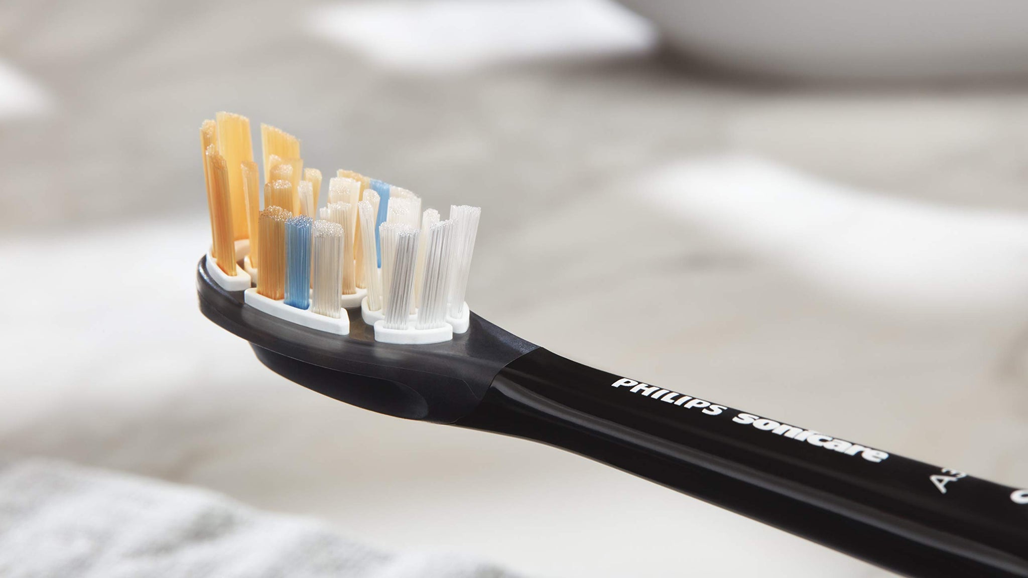 Details: Experience the best of Philips Sonicare toothbrush heads with this genuine All-in-one replacement. Offering effective whitening, plaque removal plus better gum health, your complete oral care starts right here. These electric toothbrush replacement heads with multi-angle bristles were designed to keep plaque removal on course, no matter your technique. Philips Sonicare A3 brush head delivers range-leading cleaning and removes up to 2000% more plaque than a manual toothbrush, even in hard-to-reach areas. It also includes triangular bristles to increase surface contact and clean away stains more effectively. Trust proven Sonicare technology: the Philips Sonicare toothbrushes clean gently yet effectively and care for your teeth and gums with up to 62,000 bristle movements. Sonicare Fluid Action supports cleaning by driving fluid deep between teeth and along the gumline. All Philips Sonicare sonic toothbrush heads are meticulously designed and clinically tested to meet the highest standard in quality, safety and performance. They are compatible with all Philips Sonicare click-on electric toothbrushes⁵. Dental professionals recommend changing your brush head every 3 months, that's why Philips Sonicare toothbrushes have BrushSync technology. It tracks how often and how hard you brush, and the light on the handle turns on when it's time to replace your brush head.⁷ You will also know when to replace it when blue bristles turn white. ¹ than a manual toothbrush ² vs. a manual toothbrush in a lab study ³ allocated to plastic of brush head on mass balance basis ⁴ where facilities exist ⁵ not compatible with Philips One and e-series handles ⁶ in hard-to-reach areas ⁷ the feature is available for BrushSync-compatible handles