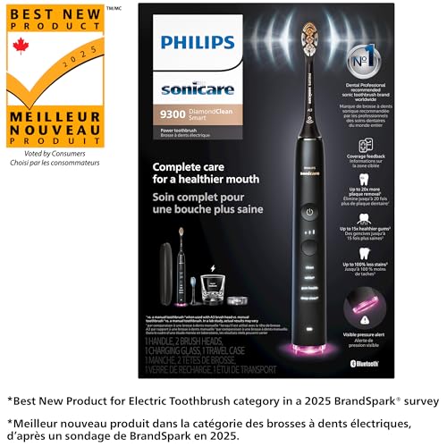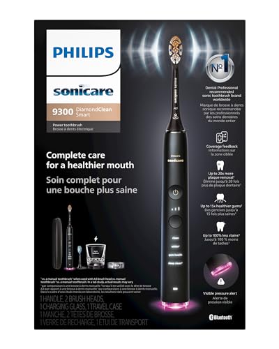 Details: Philips Sonicare DiamondClean Smart 9300 electric toothbrush provides complete and efficient oral care, removing up to 20x more plaque¹, providing up to 15x healthier gums¹ and removing up to 100% more stains than a manual toothbrush. High-performance brush heads let you focus on all areas of your oral health, while our Smart Sensor technology gives you personalized feedback and coaching. There are 4 brushing modes: Clean mode for daily cleaning, White+ for stain removal, Gum Health for gentle but effective cleaning of the gums and Deep Clean+ for a refreshing, thorough clean. There are also 3 intensity levels to choose from. The built-in Philips Sonicare light ring pressure sensor lets you know if you’re pressing too hard. Advanced Sonic Technology provides gentle yet effective cleaning, pulsing fluid between teeth and along the gumline with a cleaning power of 62,000 bristle movements per minute. By connecting to the Philips Sonicare app, you will be able to receive personalized brushing guidance to maintain and improve your brushing habits. The app lets you know when you’ve achieved a thorough clean and coaches you to be a better, more mindful brusher. The innovative BrushSync™ technology will let you know when it’s time to change your brush head. Improve your brushing technique with QuadPacer and reach your recommended brushing time of 2 minutes with SmarTimer. Philips Sonicare DiamondClean Smart 9300 works perfectly as a travel toothbrush thanks to the travel case. You can also top up the power at home with the iconic charging glass. With regular use, the battery will last up to two weeks on a single charge (based on two periods of two-minute brushings per day on standard mode). ¹ vs. a manual toothbrush ² vs. a manual toothbrush. In-vitro study, actual results may vary ³ based on a study of over 2,600 dental professionals (dentists and hygienists) conducted in the United States, Canada, Japan, China, Korea, Thailand, Germany, the United Kingdom, Switzerland, France, Belgium, Austria, Italy, Spain, Sweden in 2022-2023