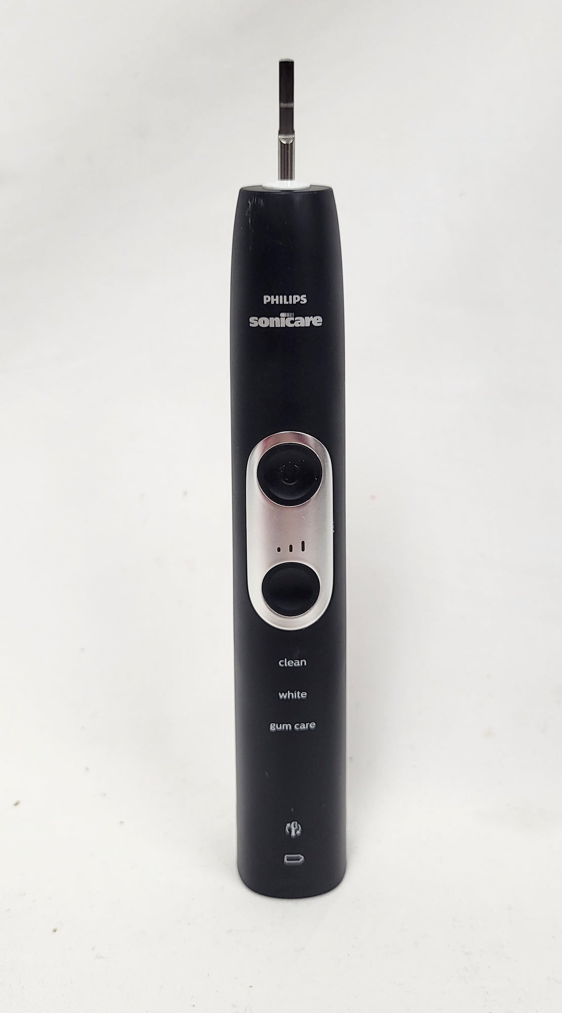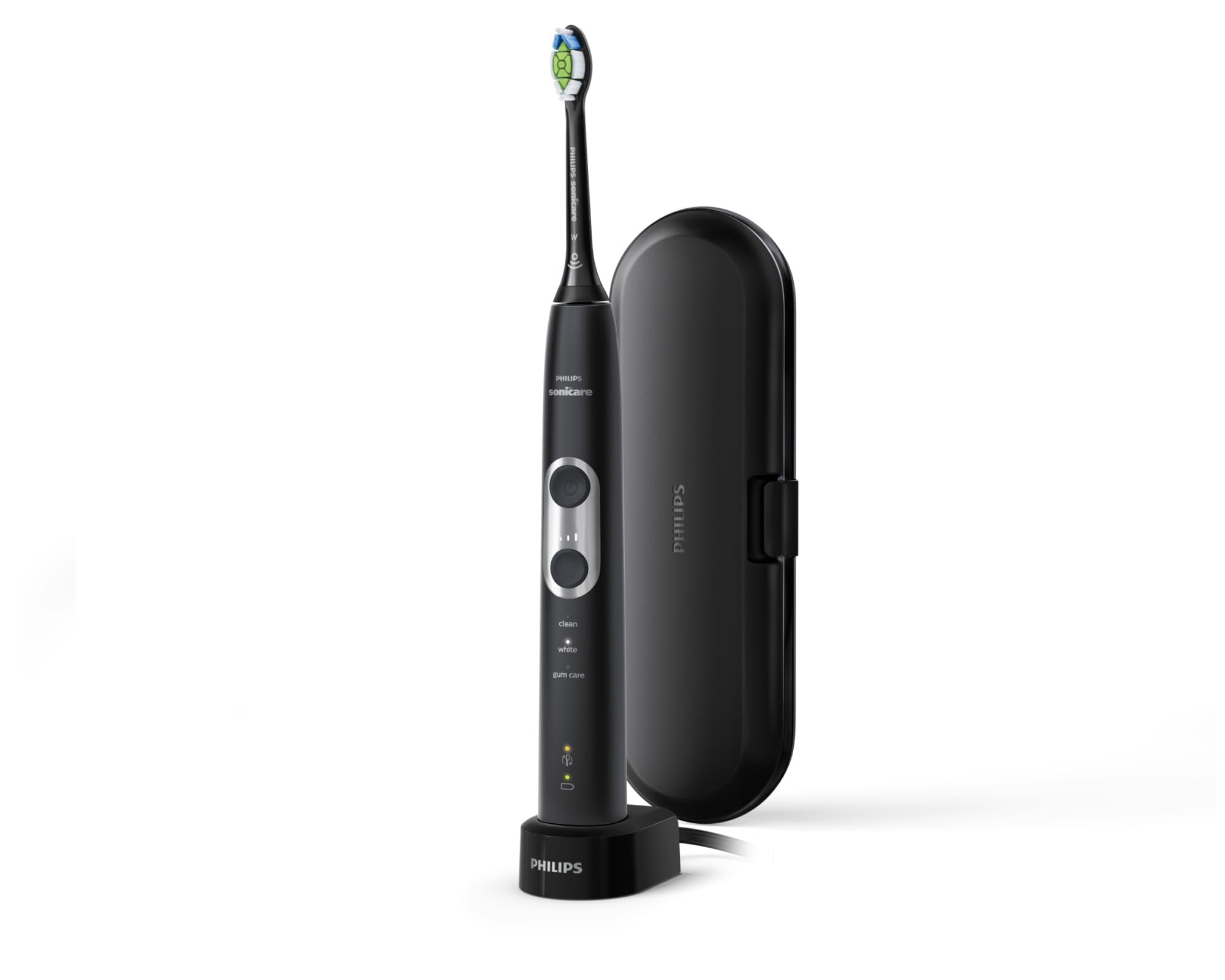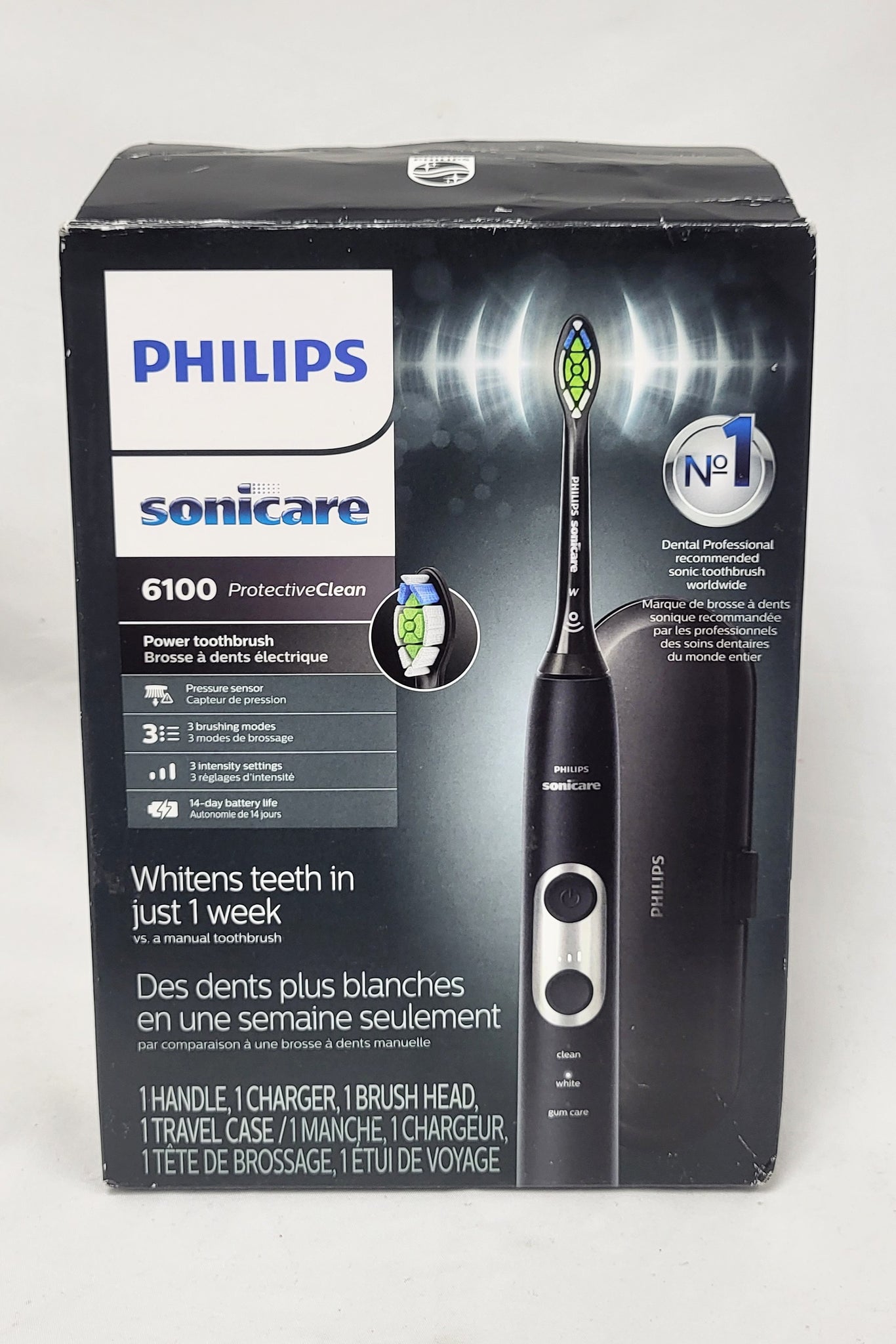 Details: ProtectiveClean 6100 rechargeable electric toothbrush delivers up to 100% less stains in just 7 days to whiten your teeth in just 1-week vs a manual toothbrush. It has a pressure sensor that protects teeth and gums from excess brushing pressure. Brush heads wear out over time. Our BrushSync technology tracks how long you have been using your DiamondClean brush head and how hard you have been brushing. It will beep to inform you when to replace your brush head. Customize your own brushing experience with intensity settings and your choice of 3 modes: Clean, White and Gum Care. The easy-start feature slowly increases the power of the brush as you get used to the Sonicare experience and the smartimer encourages a full 2 minutes brushing time as recommended by your dental professional. The battery charge indicator light lets you know when it is time recharge; 2 week battery life. The kit includes 1 ProtectiveClean 6100 handle, 1 DiamondClean brush head, 1 charger, 1 travel case