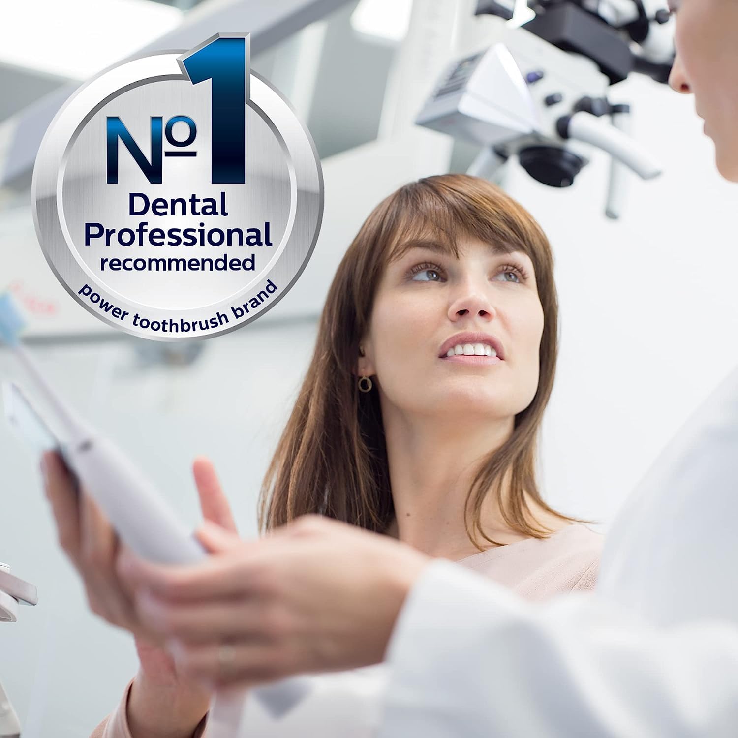 ProtectiveClean 6100 rechargeable electric toothbrush delivers up to 100% less stains in just 7 days to whiten your teeth in just 1-week vs a manual toothbrush. It has a pressure sensor that protects teeth and gums from excess brushing pressure. Brush heads wear out over time. Our BrushSync technology tracks how long you have been using your DiamondClean brush head and how hard you have been brushing. It will beep to inform you when to replace your brush head. Customize your own brushing experience with intensity settings and your choice of 3 modes: Clean, White and Gum Care. The easy-start feature slowly increases the power of the brush as you get used to the Sonicare experience and the smartimer encourages a full 2 minutes brushing time as recommended by your dental professional. The battery charge indicator light lets you know when it is time recharge; 2 week battery life. The kit includes 1 ProtectiveClean 6100 handle, 1 DiamondClean brush head, 1 charger, 1 travel case