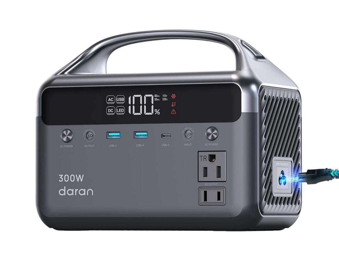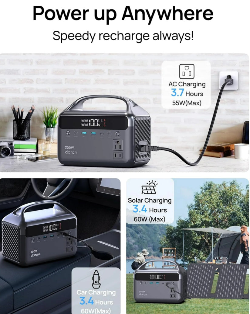 - Multiple Charging Options: 300W pure sine wave AC output + 6 ports (2 AC, 1 USB-C, 2 USB-A, 1 DC5521) safely powers laptops, drones, and mini-fridges. Protects devices from unstable power.