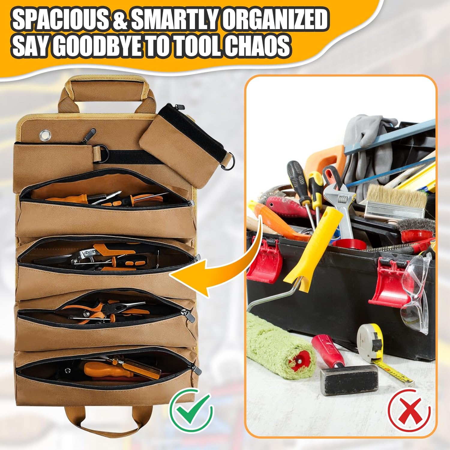 • 4 Large Pockets + 2 Small Pouches for Ultimate Organization:With 4 spacious main pockets and 2 compact pouches, this tool roll bag keeps your tools neatly organized and easily accessible, perfect for plumbers, carpenters, and handymen.