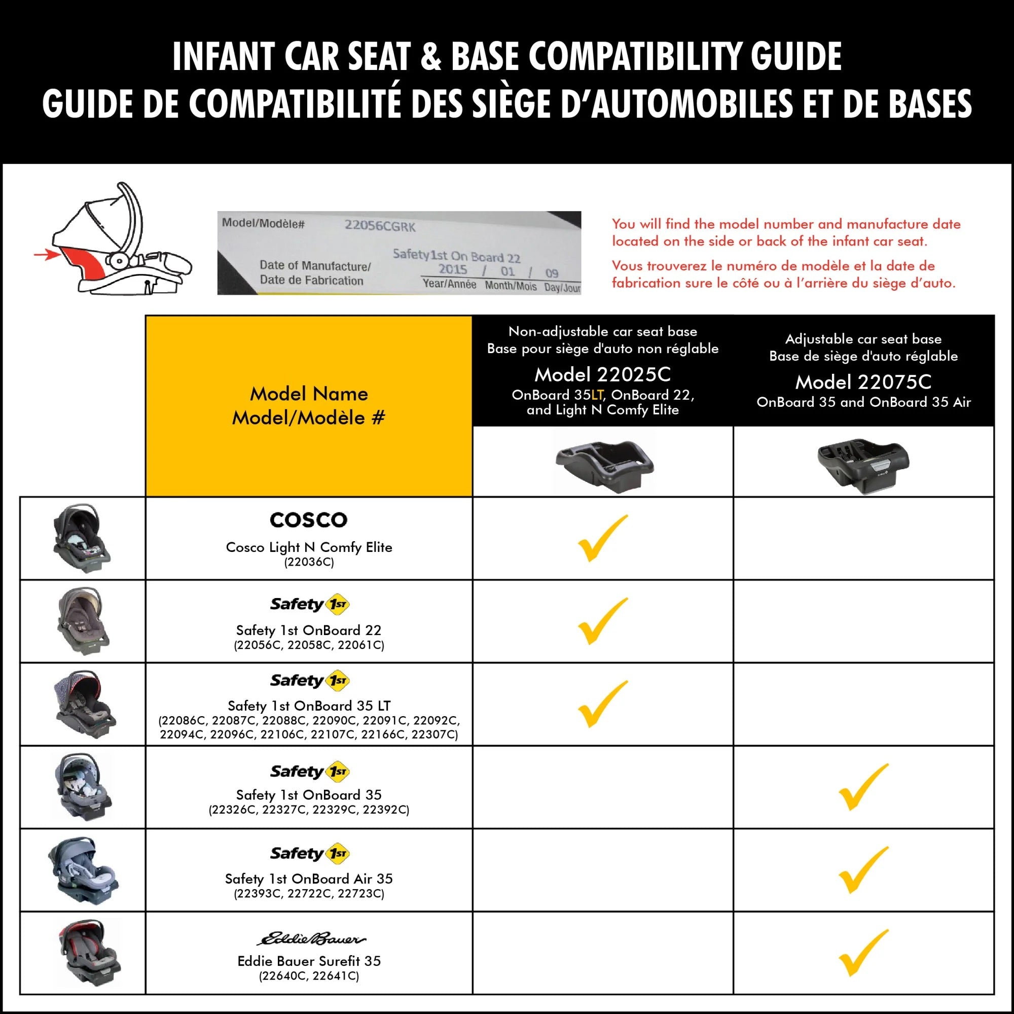 Always on the go? You have the Safety 1st Base, a convenient accessory, compatible with Safety 1st onBoard 35 Infant Car Seats, Lux by Safety 1st infant car seats, and Eddie Bauer SureFit 35 Car Seats. The 5 position adjustable base makes it ideal for use as a stay-in-car base for a secondary car. It is compact and is UAS equipped.