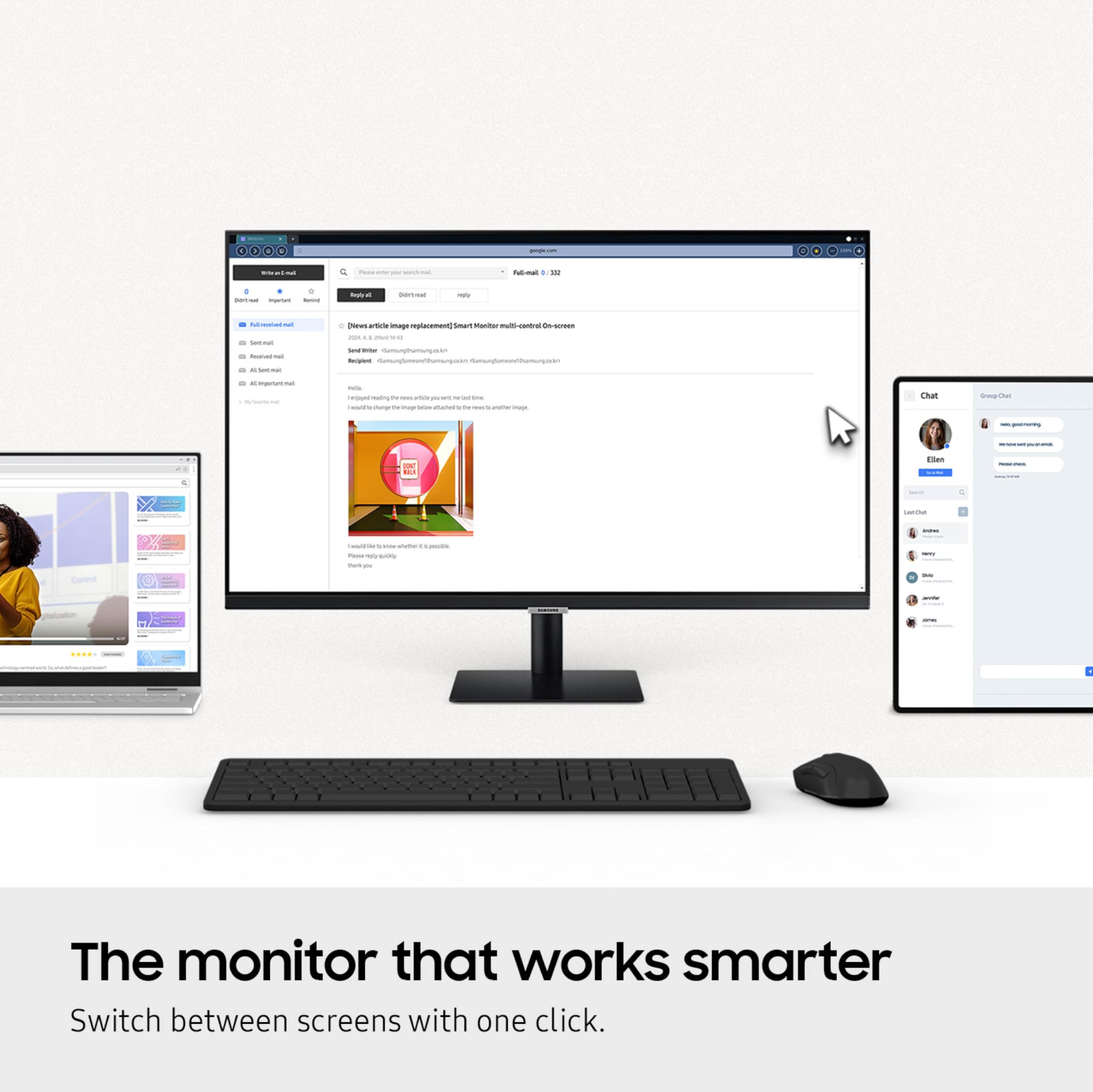 - 1 MOUSE & KEYBOARD ACROSS DEVICES: Maximize multitasking by controlling multiple devices with one mouse and keyboard; Seamlessly drag & drop content across the Smart Monitor, a Galaxy Tab & Galaxy mobile device, streamlining your workflow²
