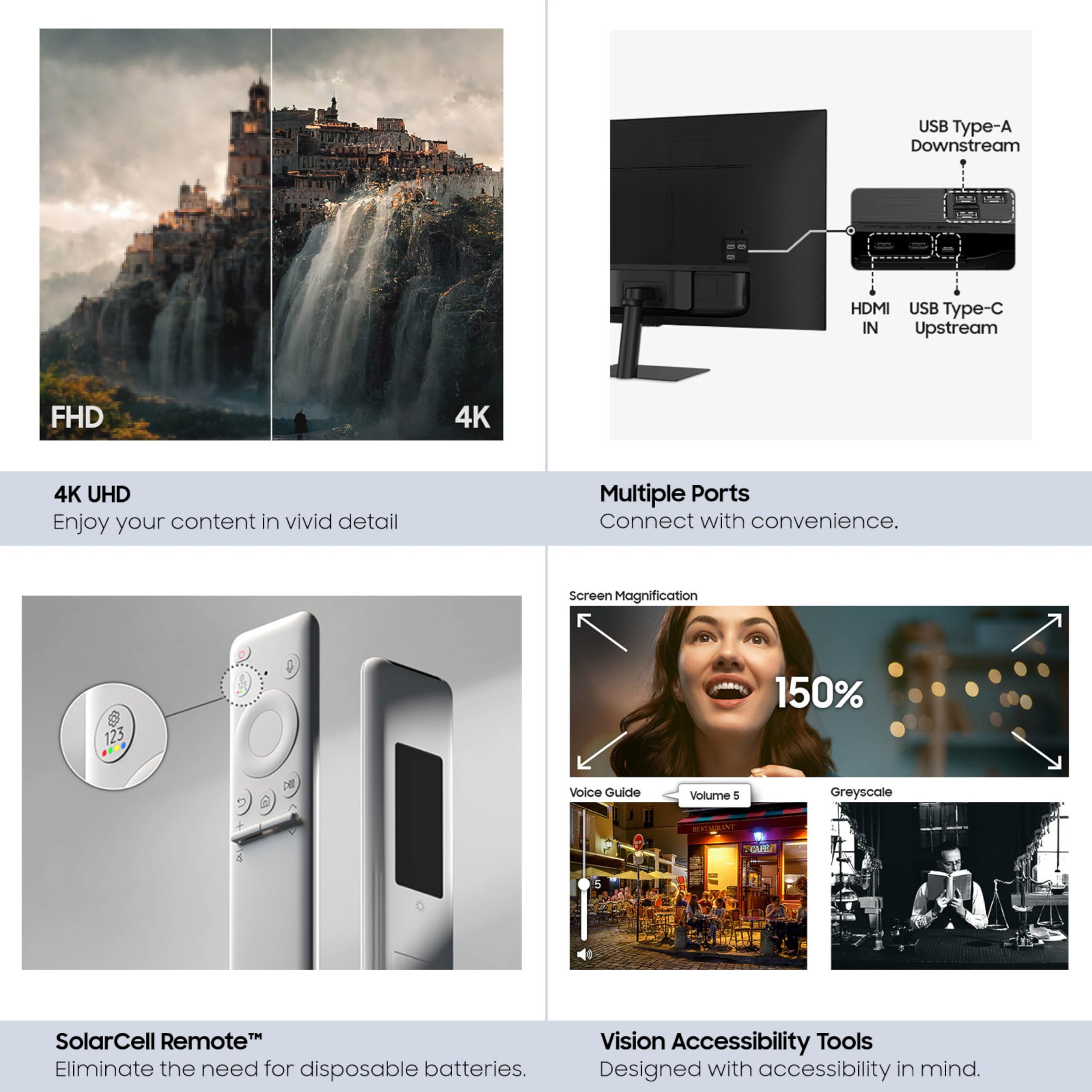 - CONNECT w/ CONVENIENCE: With USB-C, HDMI & USB-A ports, you can connect to the Smart Monitor without adapters; Charge devices, transmit data & make the most out of your multiscreen setup - or do all at once - thanks to the 4 available ports