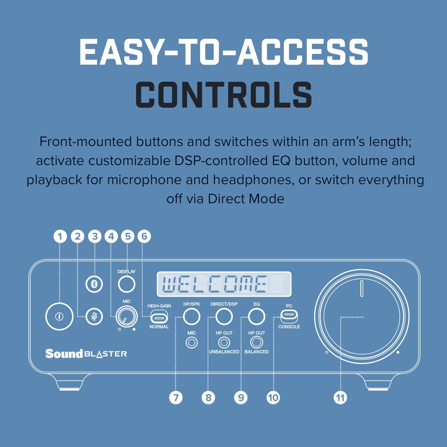 • EASY-TO-ACCESS CONTROLS - The Sound Blaster X5 features an entire getup of front-mounted buttons and switches that are easy-to-access and intuitive for everyone. Activate the customizable DSP-controlled EQ button, instantly increase or decrease mic / headphones input gain, mute or unmute your microphone, or turn off all processing with Direct Mode switch; all the convenience are at your fingertips