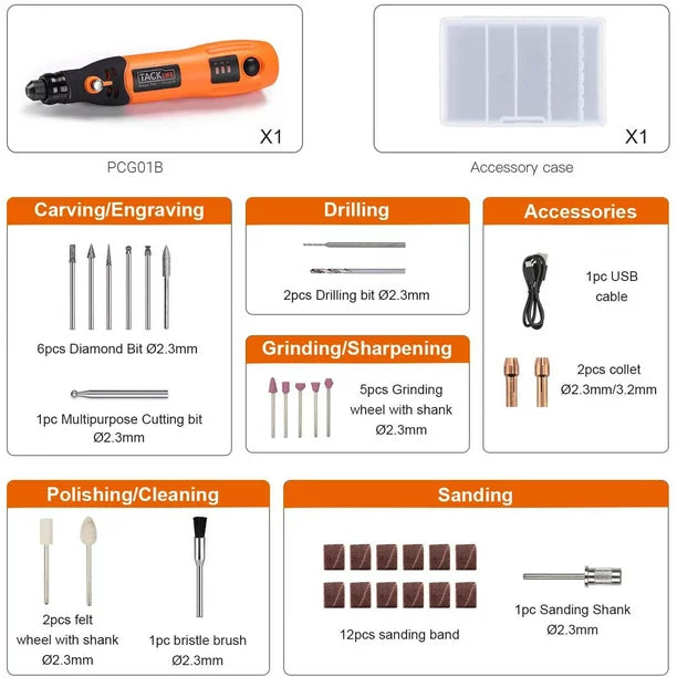 Tacklife 3.7V Cordless Rotary Tool Portable, Perfect for Nail Polishing and Light Duty, 31 Accessories and USB Charging Cable-PCG01B