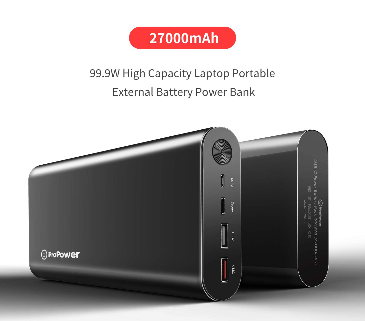 iProPower USB-C PD Power Bank 27000mAh, iProPower Portable External Battery Pack Power Delivery Charger for MacBook Air/Pro Camera iPhone 99.9 Wh